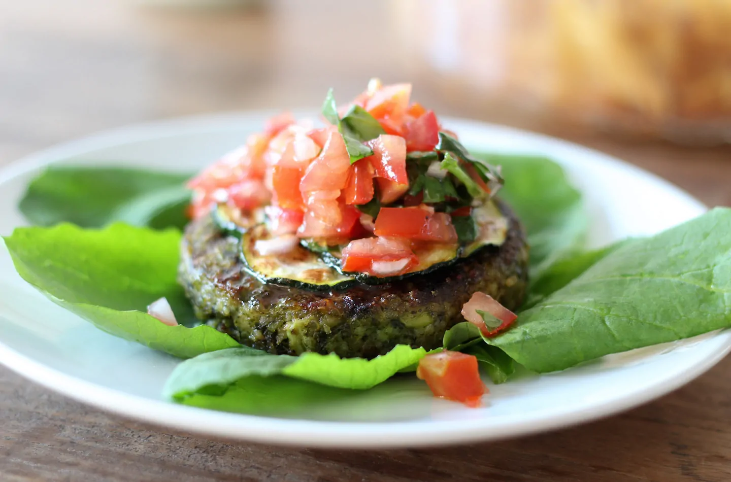 We beginnen de week met een lekkere veggie burger met courgette en tomaten-basilicumsalsa. Met deze burger is het net alsof je een burger eet maar dan veel lichter en frisser!