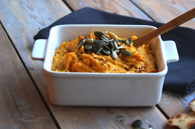 Met de andere helft van de pompoen kun je deze pompoen hummus maken. Lekker als dip bij zelfgebakken naan, maar ook als broodbeleg voor jong en oud.