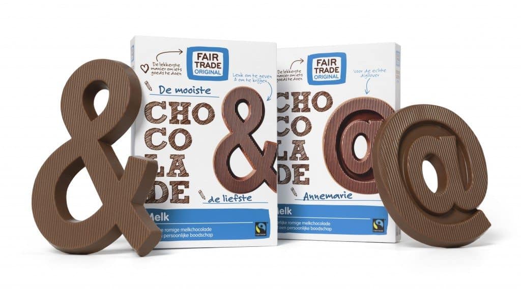 De letter @ kun je richten aan wie je wilt. @wie zoet is, @mijn lieve zus, @juf Evelien. Tegelijkertijd worden de cacao- en suikerboeren er beter van. Zij besteden de fairtrade ontwikkelingspremie bijvoorbeeld @nieuwe wegen, @schoolgeld voor de kinderen of @nieuwe gereedschappen. Ook de letter & is er voor iedereen. Voor familie, vrienden, collega’s. Én voor de cacao- en de suikerboeren. Zij verkopen hun product tegen eerlijke handelsvoorwaarden. Dat geeft hen meer zekerheid & een goede prijs.