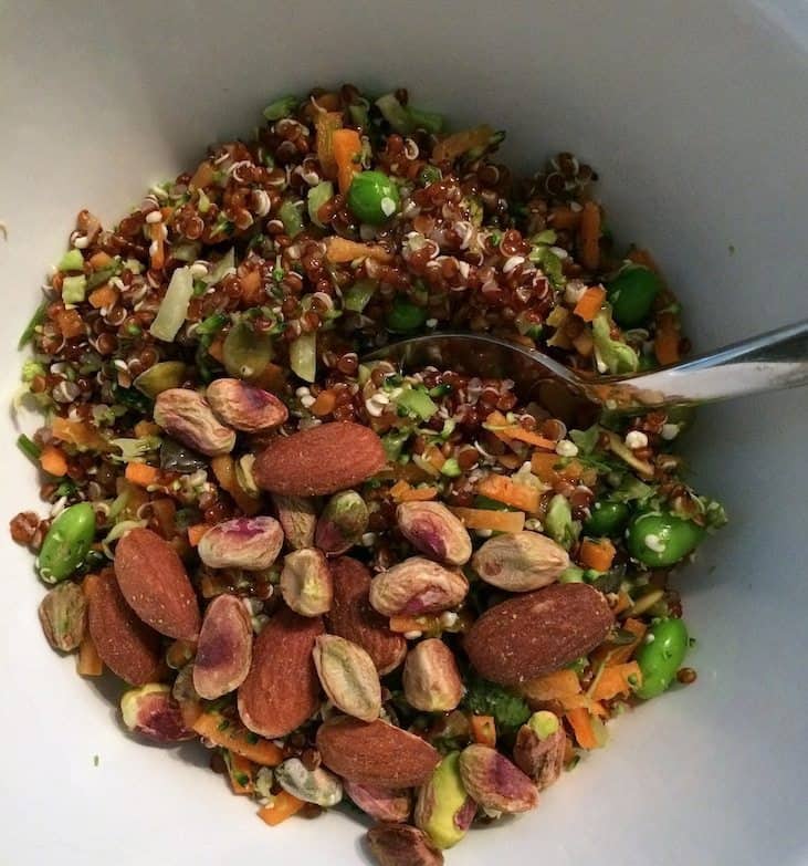 – Quinoasalade met groene groenten, noten en zaden: quinoa met wortel, tuinerwten, pompoenpitten, hennepzaad, koriander en soja-gemberdressing