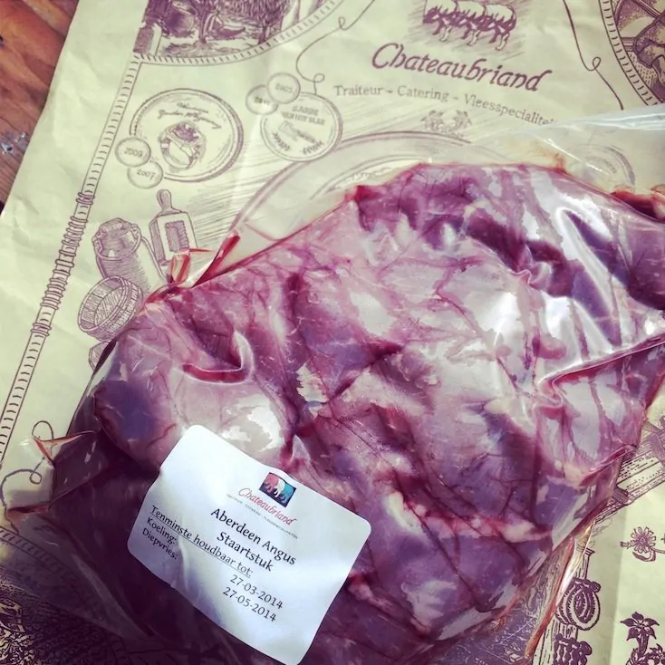 Tot zover een prachtig verhaal, maar hoe smaakt dit stukje vlees dan? Ik mocht het voor jullie testen en krijg een prachtig stuk Aberdeen Angus staartstuk thuisgestuurd van Chateaubriand, de traiteur/cateraar/vleesspecialist uit Heemstede. Wat een feest om de (gekoelde) verpakking te openen en daar dit prachtige vlees te zien liggen. De kruiden en een pot homemade bearnaisesaus waren ook van de partij. Het etentje voor de volgende dag was gelijk gepland.
