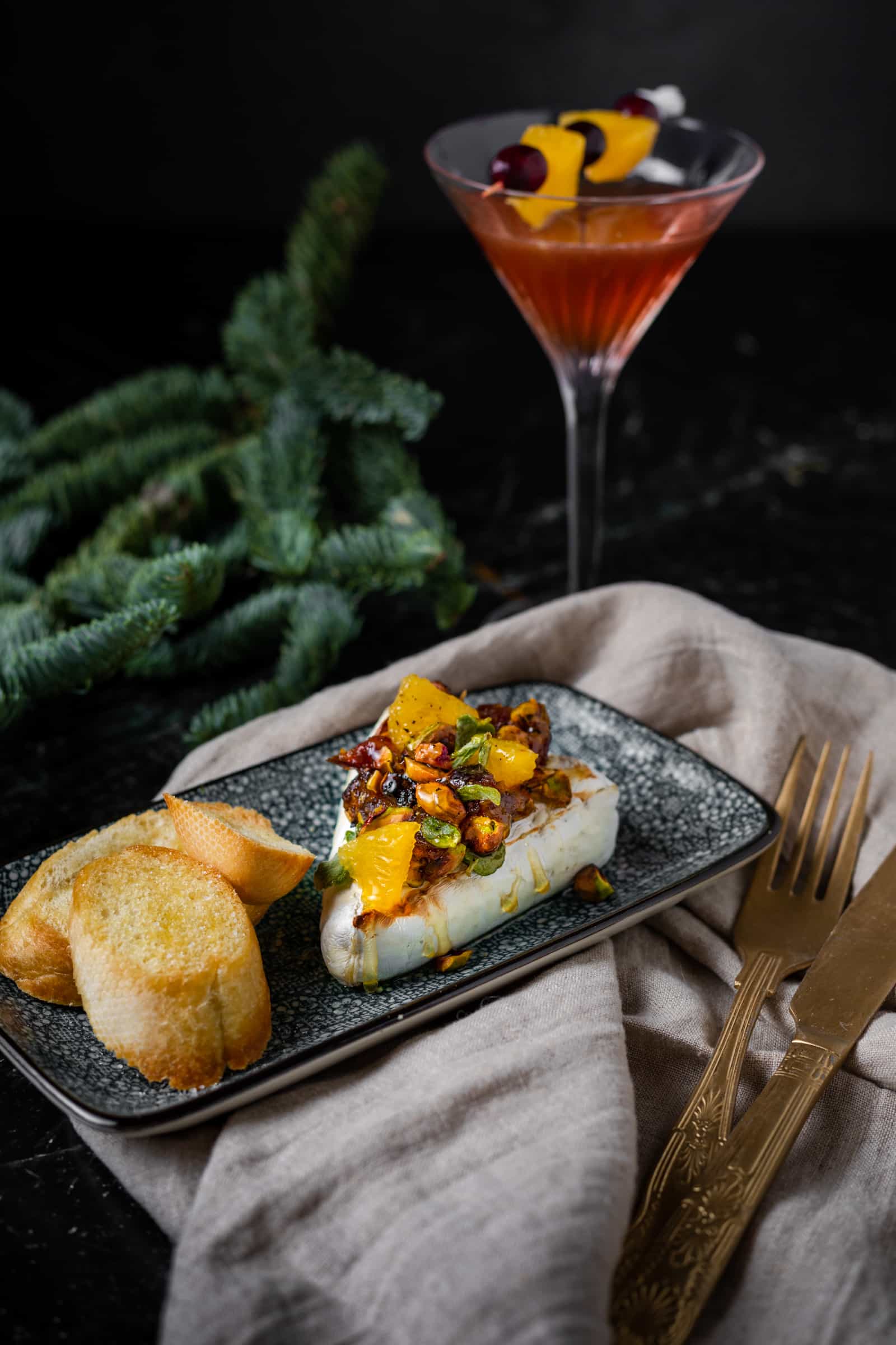 1. Borrelhapje of amuse: Gebakken brie met dadel, pistache en sinaasappel