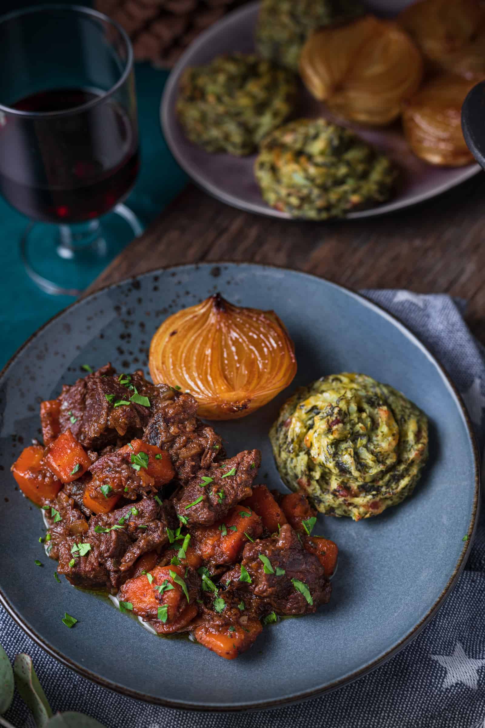 Voor het hoofdgerecht ben ik dit jaar volledig op de klassieke tour gegaan, maar wel met een aantal leuke twists! Wat resulteerde in zalig stoofvlees met pommes duchesse van zelfgemaakte boerenkoolstamppot en gekarameliseerde uien. De combinatie was echt zalig! Hier vind je het recept.