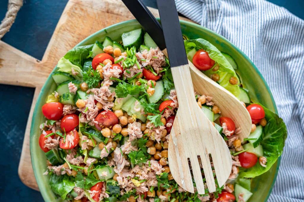 Deze salade met kikkererwten, knoflook en tonijn maakte ik onlangs voor een zomerse lunch in de tuin en ik was verrast door de ontzettend lekkere smaak. Heel makkelijk om te maken en als avondeten voor 4 personen verdubbel je gewoon de hoeveelheden.