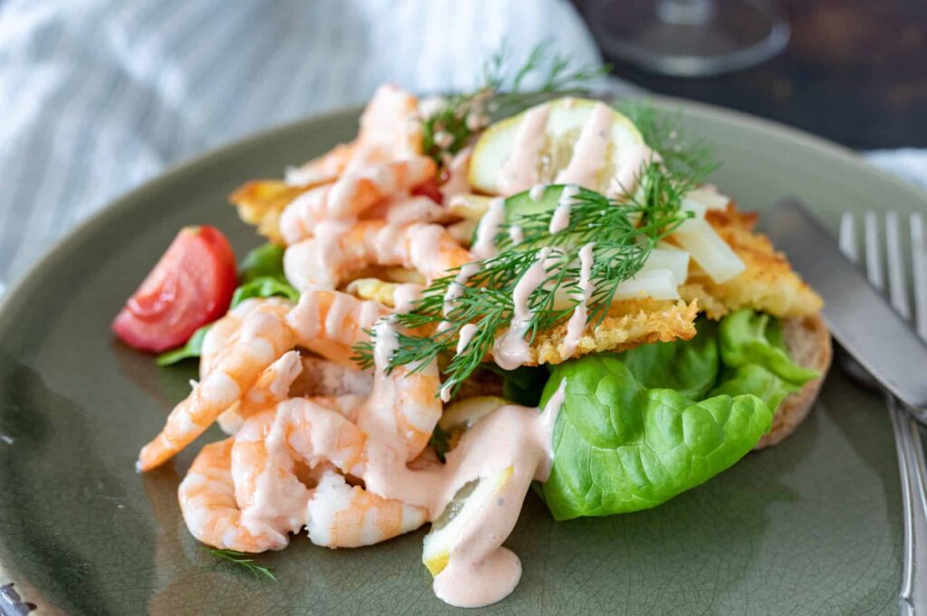 Ja ja, we gaan ook nog even naar Denemarken deze week. Een van de Deense klassiekers is het broodje ‘stjerneskud’ met gebakken schol, garnalen en een heerlijke cocktailsaus. Als dat geen comfort food is voor de vrijdag! Ik zou er lekker frietjes bij serveren.