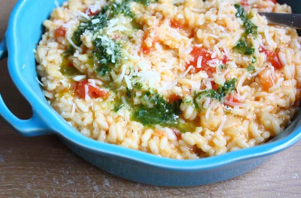Dit is misschien wel mijn favoriete vegetarische risotto. Een ogenschijnlijk simpele tomatenrisotto die een echte smaakbom wordt door de basilicumolie.