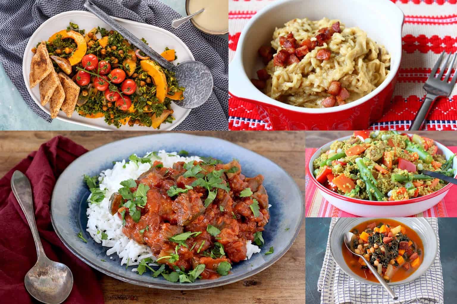 Mijn grote favorieten van deze week zijn de maaltijdsoep met cavolo nero en worst en de auberginecurry. En de risotto met zuurkool en porcini van de zaterdag. Wat een verrassend geniale combinatie was dat! Voor de zondag heb ik trouwens een heel leuk recept opgenomen voor zelfgemaakte cranberryjam met wortel en kardemom. Zalig voor het kerstontbijt of de kerstbrunch en je kunt ‘m nu al heel goed maken. Eet lekker!