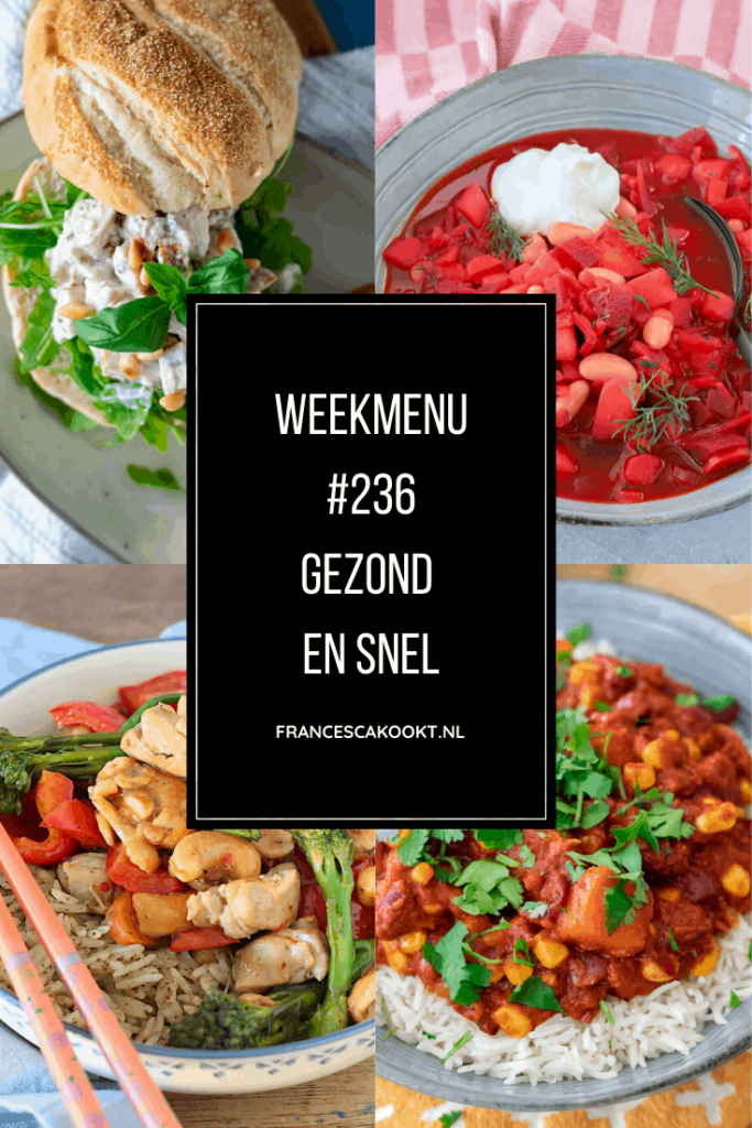 Geniet van de gerechten uit dit weekmenu! Als je een foto deelt op social media, vergeet dan niet om te taggen met #francescakookt. Zo kan ik je foto vinden en dat vind ik hartstikke leuk om te zien.