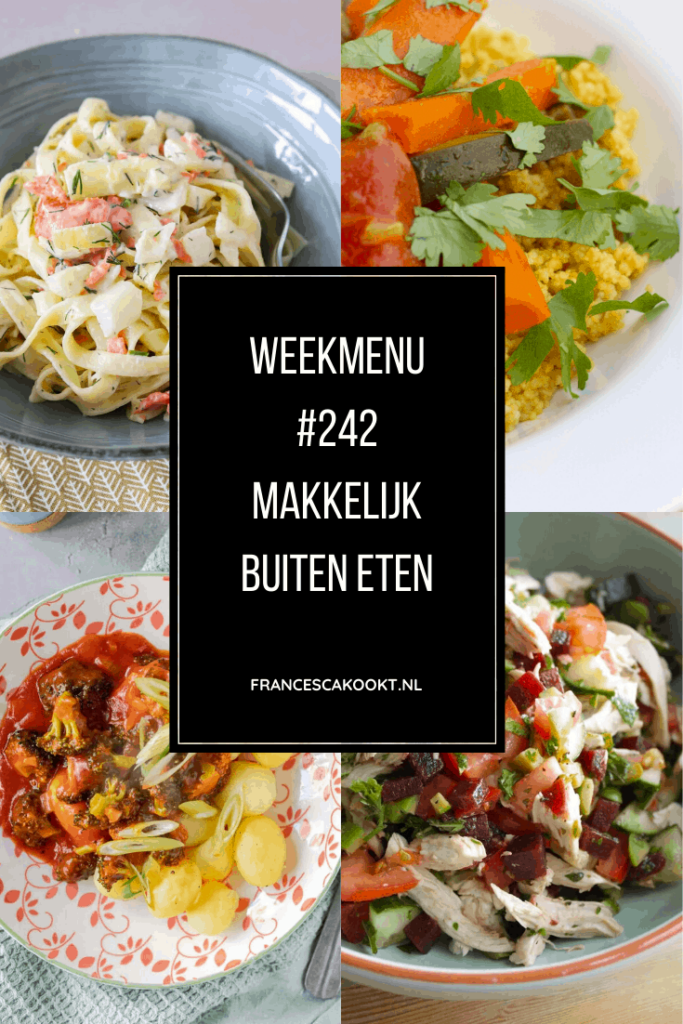 Geniet van de gerechten uit dit weekmenu! Als je een foto deelt op social media, vergeet dan niet om te taggen met #francescakookt. Zo kan ik je foto vinden en dat vind ik hartstikke leuk om te zien.