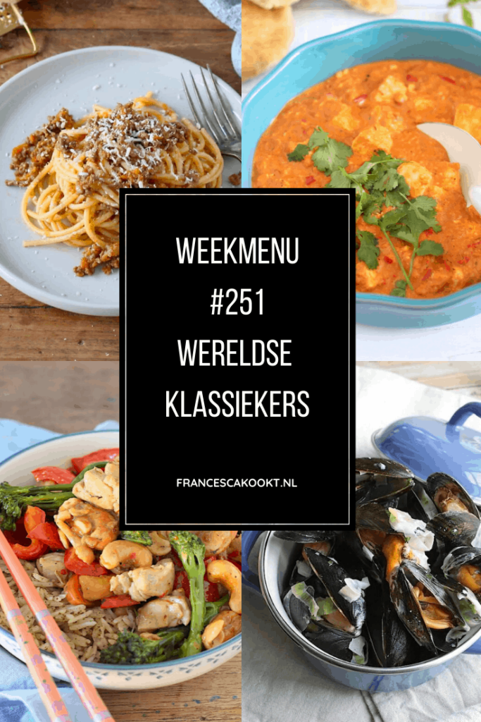 Geniet van de gerechten uit dit weekmenu! Als je een foto deelt op social media, vergeet dan niet om te taggen met #francescakookt. Zo kan ik je foto vinden en dat vind ik hartstikke leuk om te zien.