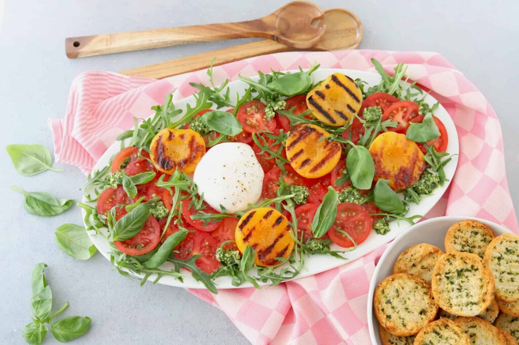 Een salade caprese is altijd goed! De authentieke salade caprese wordt meestal als voorgerecht (primo) of als bijgerechten gegeten. Deze variant met burrata en gegrilde perzik heb ik extra aangekleed met pesto en ik serveerde er gekruide crostini bij, zodat we het echt als lichte avondmaaltijd konden eten. Ideaal gerecht voor een warme zomeravond.