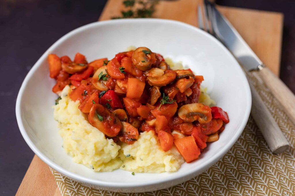 Ik begin de week met een heerlijke stamppot vol groenten! Ik stampte de aardappels los en maakt erbij een snelle stoof van onder andere kastanjechampignons, tomaat en tijm. Ik vind het zelf altijd lekker om de componenten los op mijn bord te scheppen, maar stamp het vooral door elkaar als je er een ‘echte’ stamppot van wilt maken.