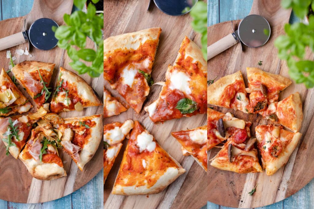 Vandaag eten we pizza! Die de kids ook gewoon zelf kunnen maken. Ik heb in totaal 3 recepten voor je: een Napolitaanse margherita, een pizza met artisjok, Parmaham, Rucola en Parmezaanse kaas, en een pizza met koningsoesterzwam, tijm en Pecorino.