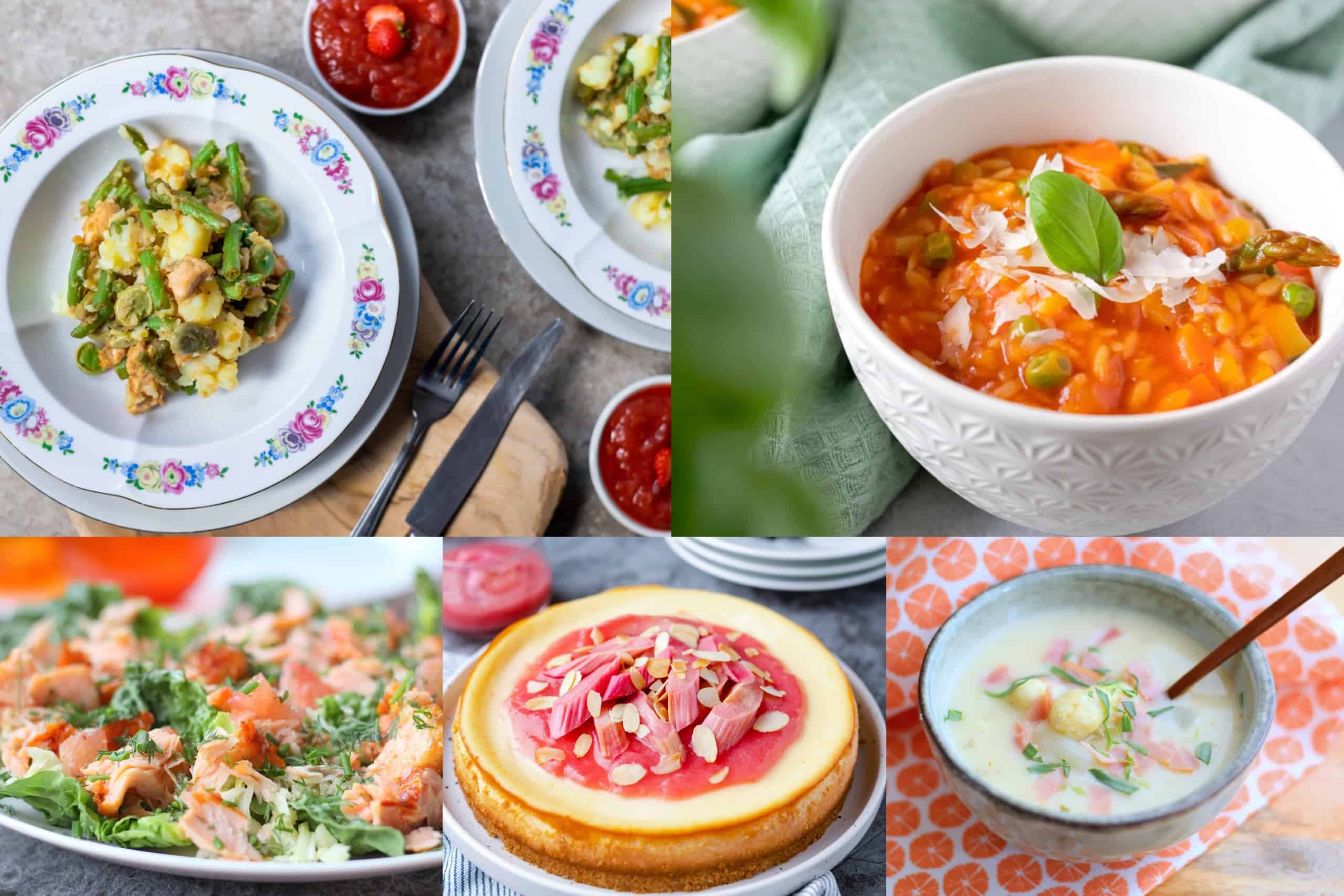 Zo vind je een minestronesoep met voorjaarsgroenten, salade met warmgerookte zalm, dille en bieslook, lentestamppot met groene bonen en rabarbercompote, asperges met zalm en hollandaisesaus en uiteraard aspergesoep in het menu. In het weekend eten we als lunch een broodje met gerookte kip en rabarberchutney en op zondag bak ik nog één keer met rabarber! Maar ik kon niet kiezen ;-). Dus er staat een ricotta cheesecake met rabarber in het menu voor de mensen die helemaal los willen gaan en een yoghurtcake met rabarber voor iedereen die snel wat wil bakken. Eet lekker!
