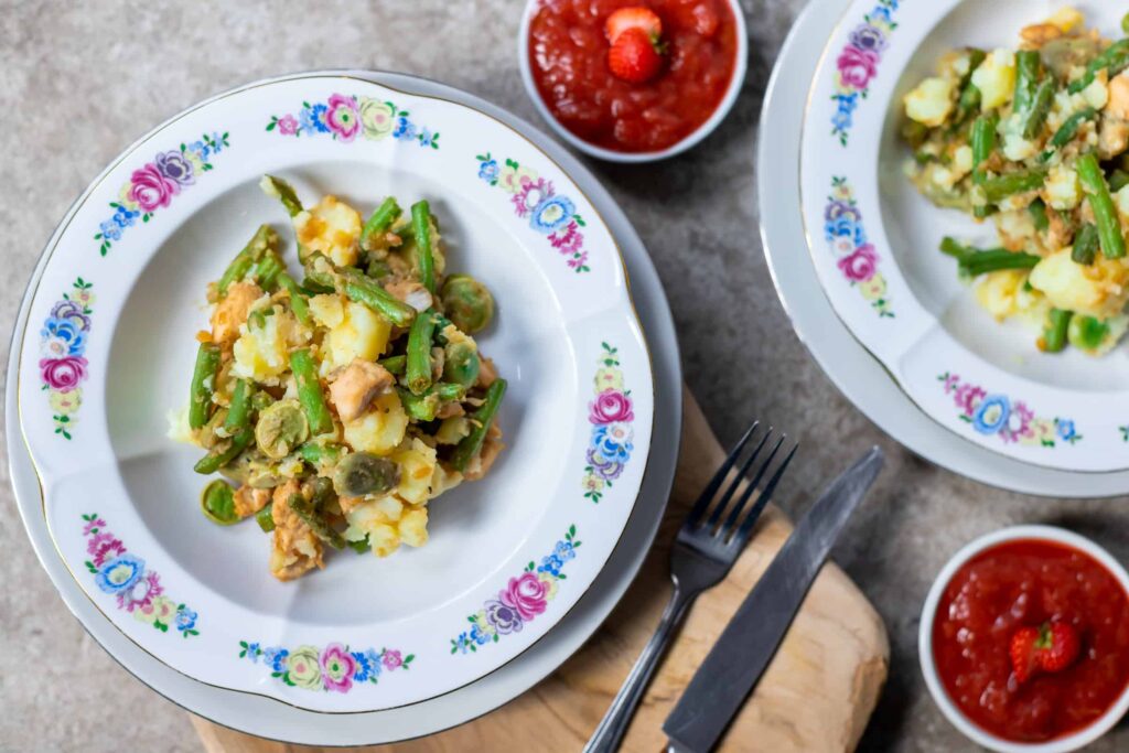 Lentestamppot, die heb ik natuurlijk ook voor je! Gevuld met onder ander groene bonen en kippendijen en geserveerd met rabarbercompote.
