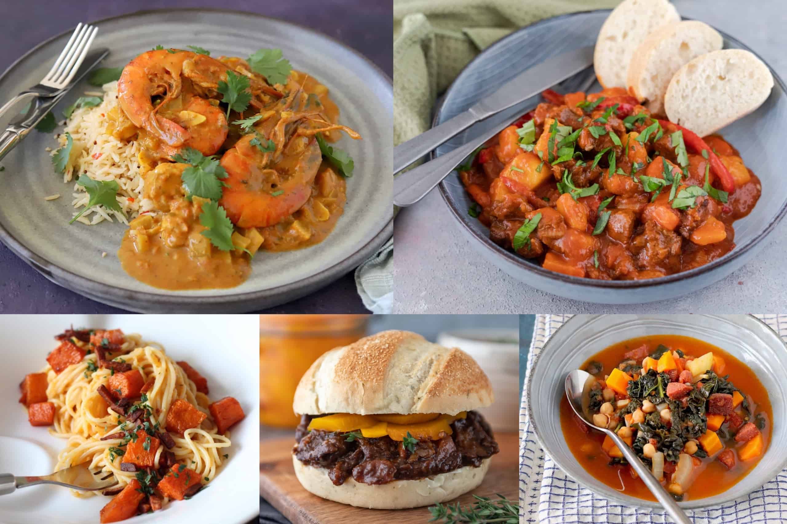 Doordeweeks eten we spaghetti met twee bereidingen van pompoen, een viscurry met zeeduivel en garnalen, maaltijdsoep met cavolo nero, kikkererwten en worst, smokey beef taco’s en zelfgemaakte goulash. In het weekend maken we royaal belegde broodjes met stoofvlees of Oosterse paddenstoelen en op zondag bakken we een onweerstaanbare apple pie. Eet lekker!