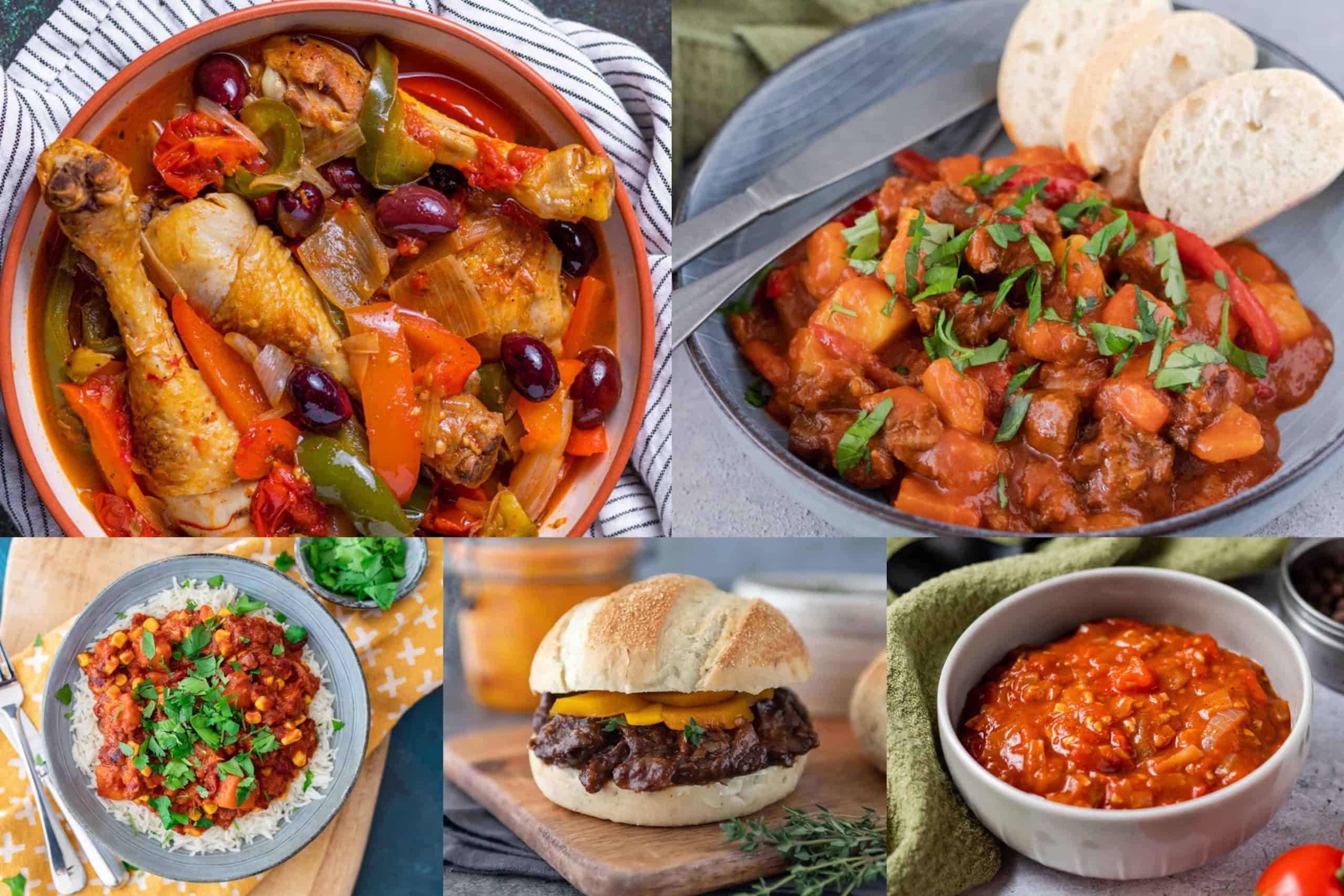 Stoven hoeft echt niet altijd lang te duren. Je kunt ook heerlijke gerechten kort stoven voor doordeweeks. En het hoeft ook niet alleen vlees te zijn, ook groenten, bonen en kip lenen zich prima voor een stoofpotje. Ik heb een mooie mix gemaakt voor dit menu. Op maandag eten we nasi met als bijgerecht gestoofde tomaten. Die zo smaakvol zijn dat je er altijd wel een potje van in huis wilt hebben staan. De rest van de week eten we een makkelijke pasta met ansjovis en tonijn, een snelle chili met pompoen, gestoofde Mediterrane kip met rijstsalade en mijn goulash. In het weekend heb ik een heerlijk broodje stoofvlees met zoetzure pompoen en voor de zondag heb ik mijn favoriete cheesecakes van de afgelopen tijd op het menu gezet. Namelijk de pompoencheesecake, om te vieren dat er weer een weekmenu is. Eet lekker!