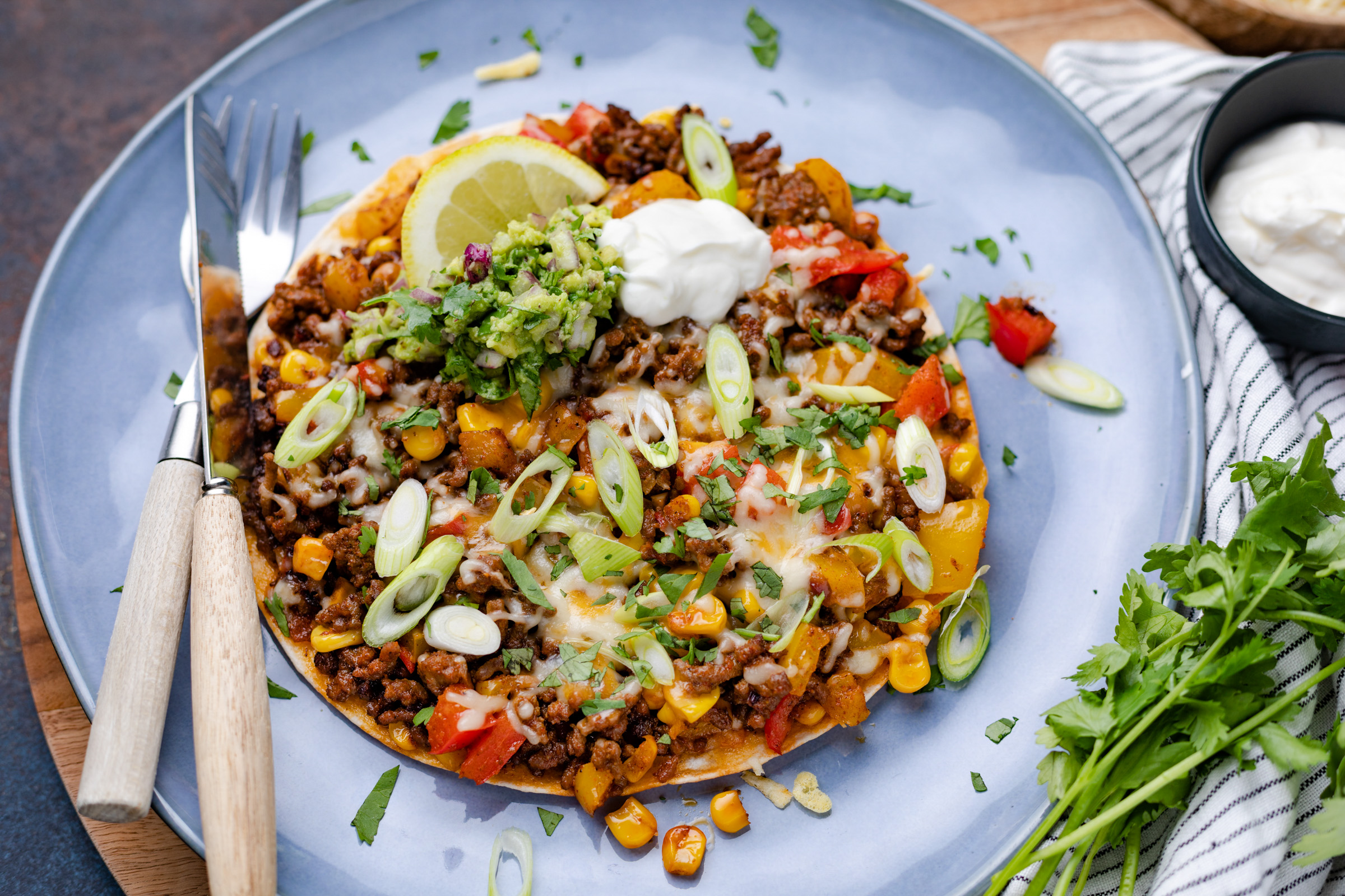 Heerlijk comfort food voor de vrijdag zijn deze tortilla’s uit de pan met een mengsel van rundergehakt, rode peper, paprika en mais. Op het laatst gaat er nog wat geraspte kaas over en de tortilla’s worden gegarneerd met zelfgemaakt guacamole, zure room en citroensap. Je kunt deze tortilla’s helemaal zoutarm maken of je voegt naar smaak nog een snuf zout toe aan de gehaktvulling.