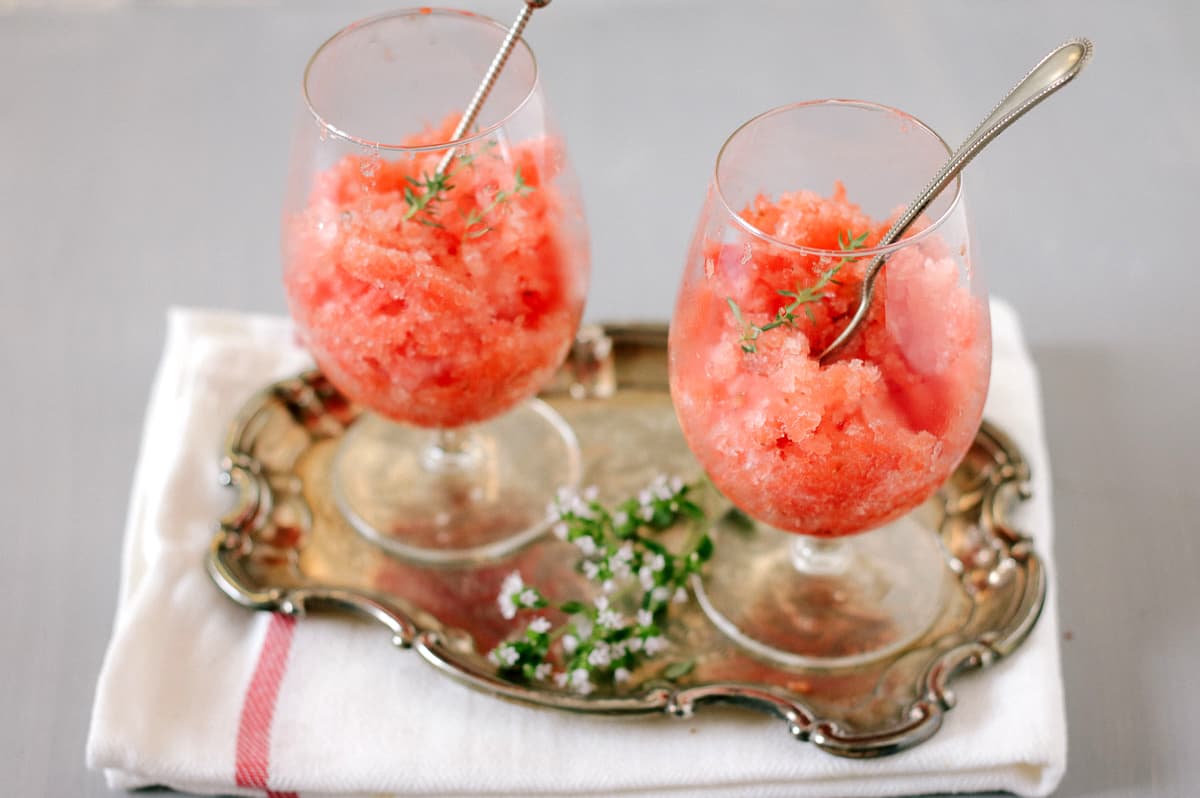 Hoe zomers wil je het hebben? Deze granita met watermeloen en vlierbloesem is makkelijk te maken en heerlijk verkoelend. De vlierbloesemsiroop geeft het een smaakvol accent, net als de verse tijm.