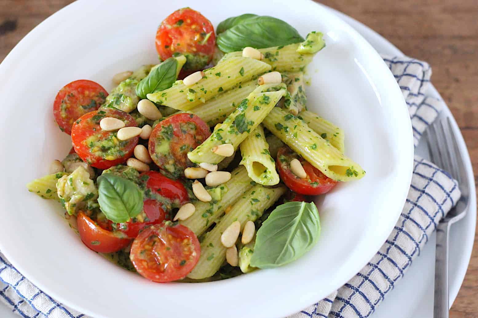Pasta pesto is een van mijn lievelingsrecepten, en deze kun je op warme dagen ook prima koud eten. Eet je dit heerlijke pasta recept liever vegetarisch? Laat dan de kip gewoon uit het recept.