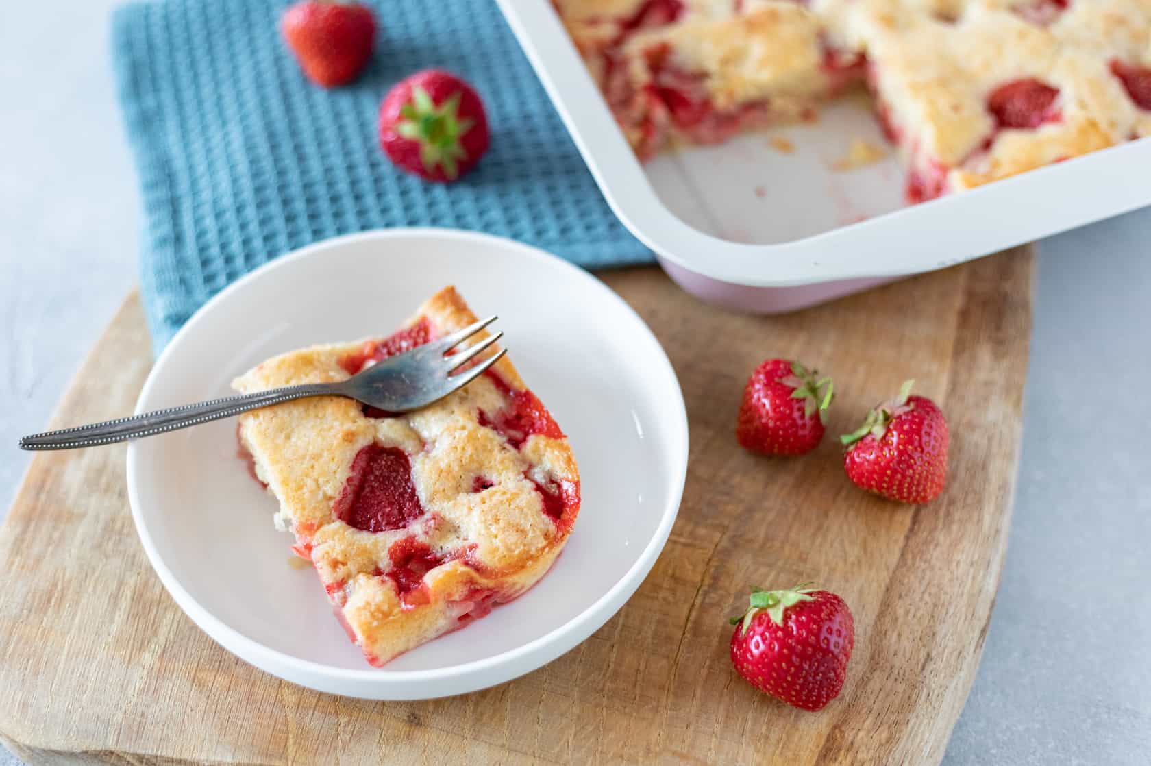 De combinatie van (heel veel) aardbeien, zachte cake, frisse zure room, citroen en een vleugje vanille is waanzinnig. Eet deze aardbeiencake het liefst lauw als dessert nadat hij net gebakken is en wees erop voorbereid dat de schaal zo leeg is. Bij de koffie kan trouwens ook, of als ontbijt, of tussendoor…