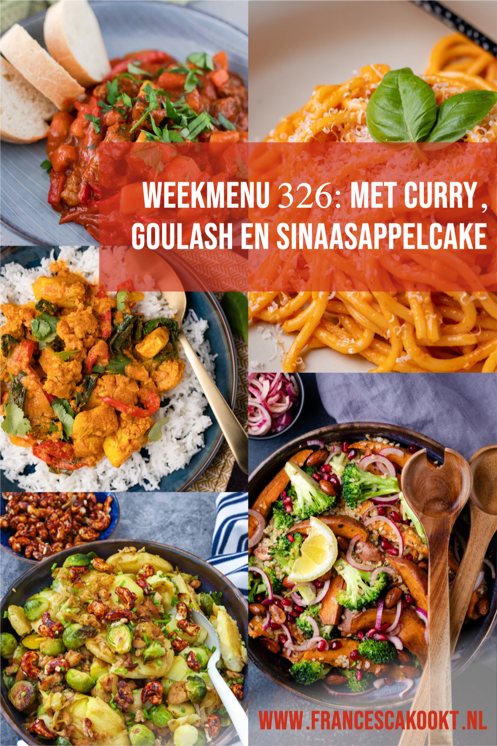 In het weekmenu vind je deze keer een zoete aardappelsalade met broccoli, bulgur en granaatappel, snelle tandoori curry, spaghetti met cherrytomatensaus, traybake met spruitjes, kipgehakt en oestersaus en zelfgemaakte goulash. In het weekend bakken we mini saucijzenbroodjes met Thaise currypasta en een omgekeerde sinaasappelcake met kaneel en piment. Eet lekker!