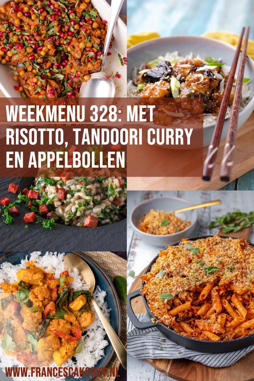 In het weekmenu vind je deze keer gebakken miso aubergine met rijst, pasta uit de oven met een krokant korstje, tandoori curry met kip en bloemkool, gevulde zoete aardappels met aubergine en kikkererwten en risotto met boerenkool, rookworst en oude kaas. In het weekend lunchen we met broodjes halloumi met jalapeño-sjalotspread en eten we appelbollen met noten, spijs en custard als toetje. Eet lekker!