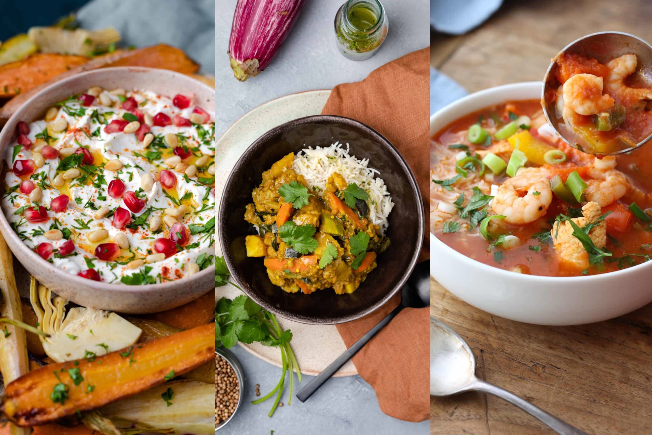 In het weekmenu vind je deze keer vegetarische curry met aubergine en pastinaak, maaltijdsoep met kip, garnalen en rijst, gezondere lasagne met meer groenten en vezels, kruidige groentestoof met harissa en kaasbroodjes en zuurkoolstamppot met masala uien. In het weekend heb ik geroosterde wintergroenten met een yoghurtdip als snack op het menu gezet en op zondag bakken we een flinke pot zelfgemaakte granola. Eet lekker!