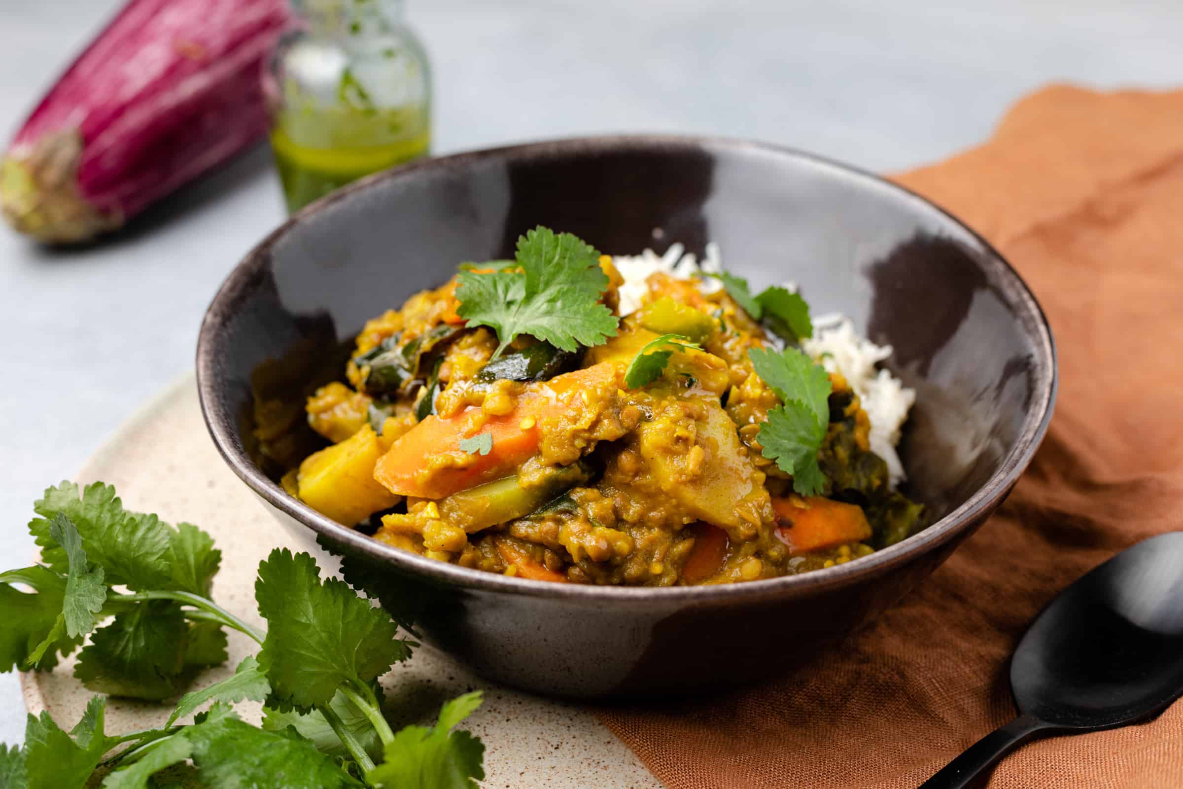 Vegetarische curry met aubergine en pastinaak