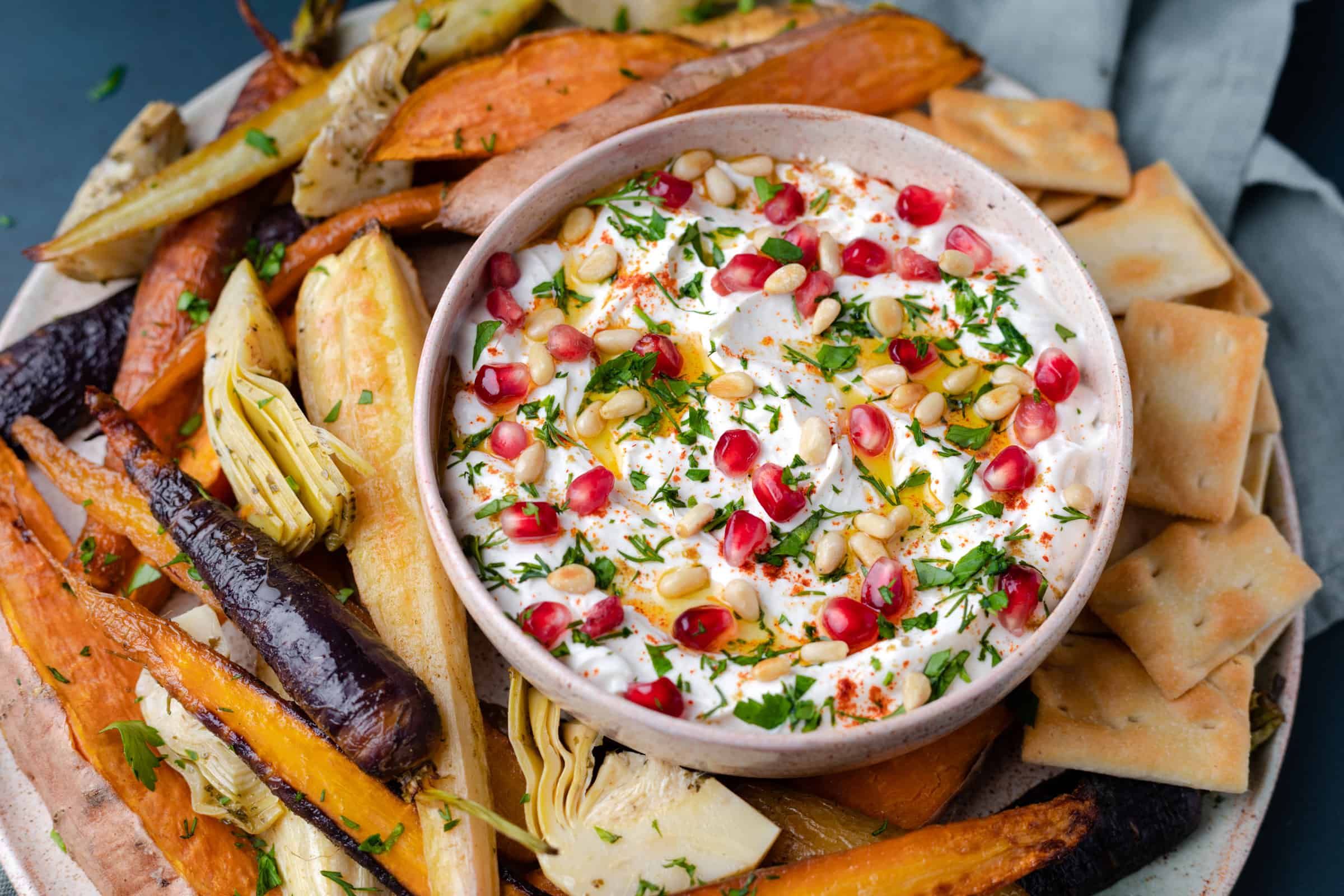 Yoghurtdip met tahin en geroosterde groenten