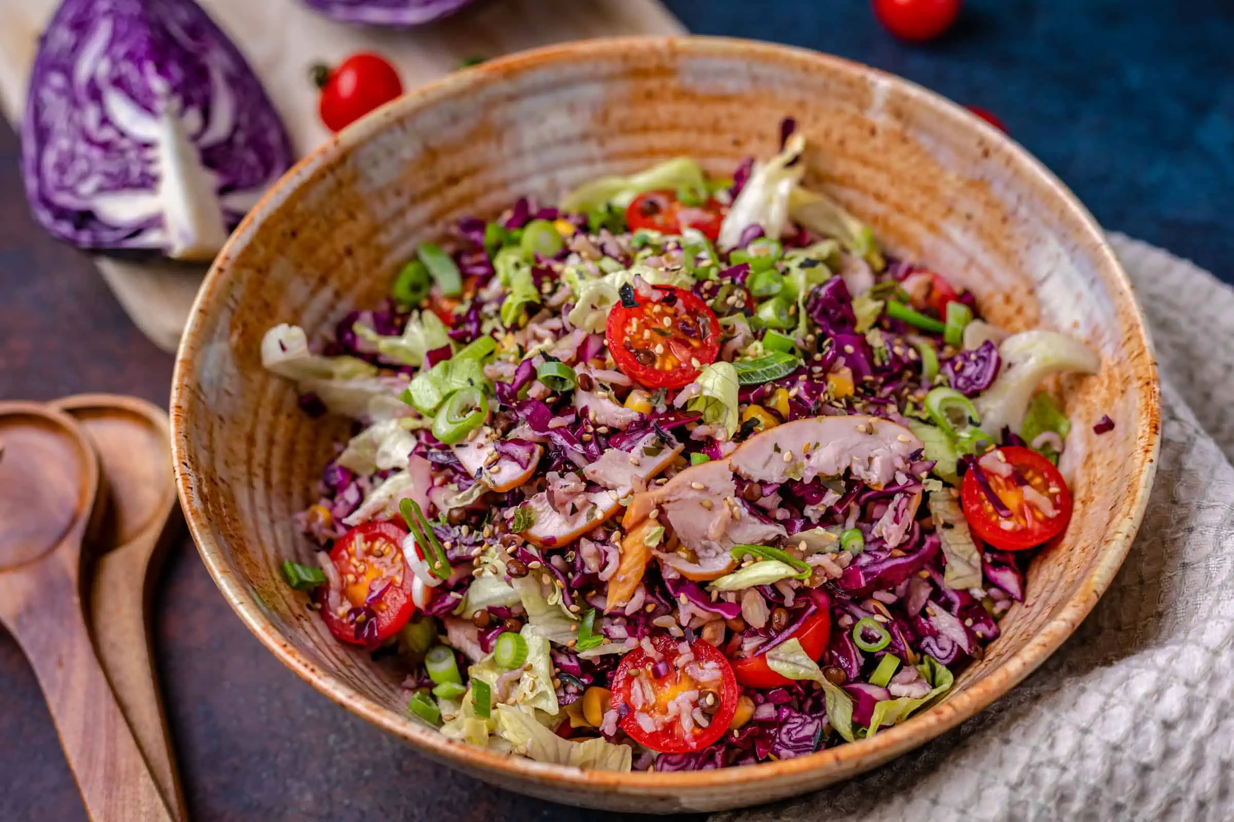 Rode koolsalade met gerookte kip, mais en sojadressing