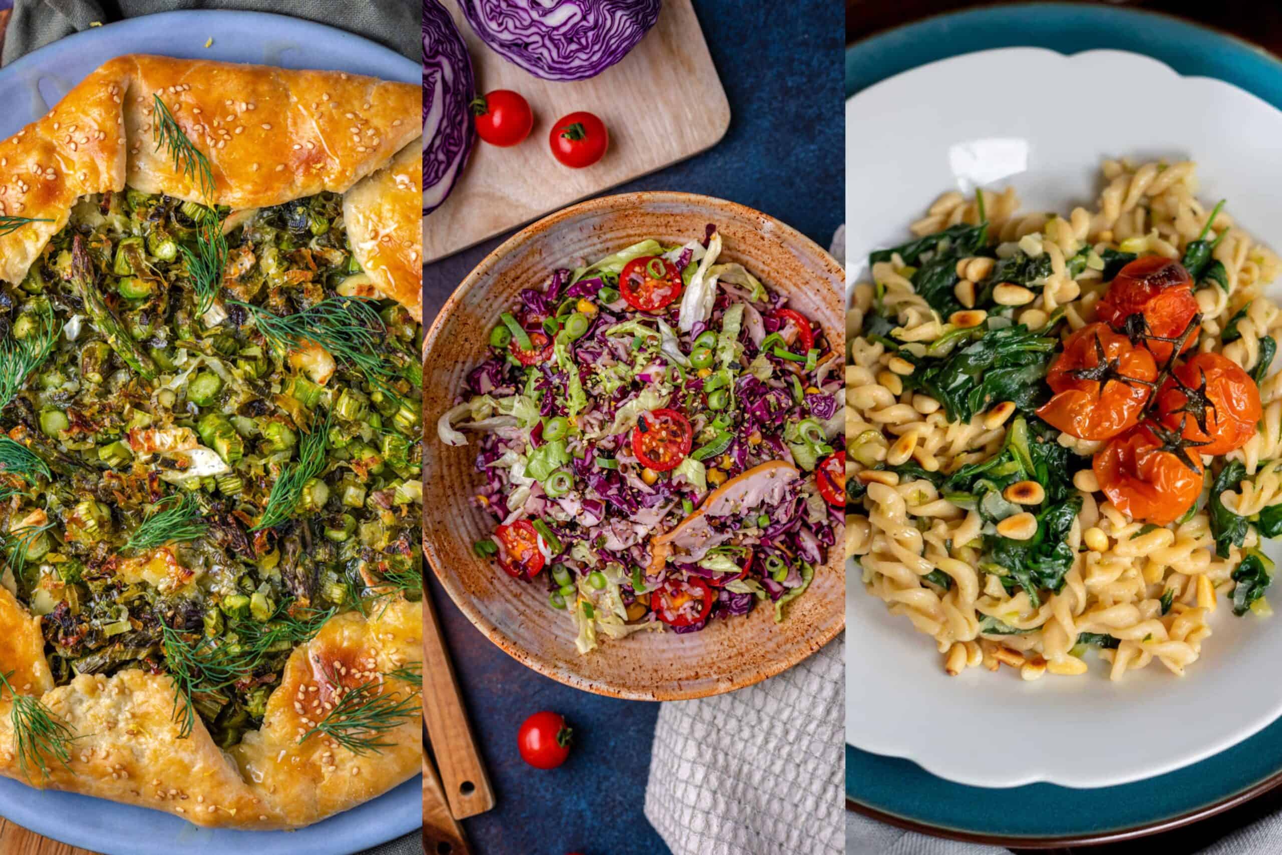 In het weekmenu vind je deze keer volkoren pasta met courgette, citroen en spinazie, lente taco’s met bloemkool, asperges en perziksalsa, dorade uit de oven met gember, knoflook en peper, salade met rode kool, gerookte kip, mais en sojadressing en een galette met groene asperges, brie en dille. In het weekend steken we de barbecue aan voor Griekse souvlaki met pita’s en salade en we maken zelf limoen-basilicumijs. Eet lekker en geniet van de zon!