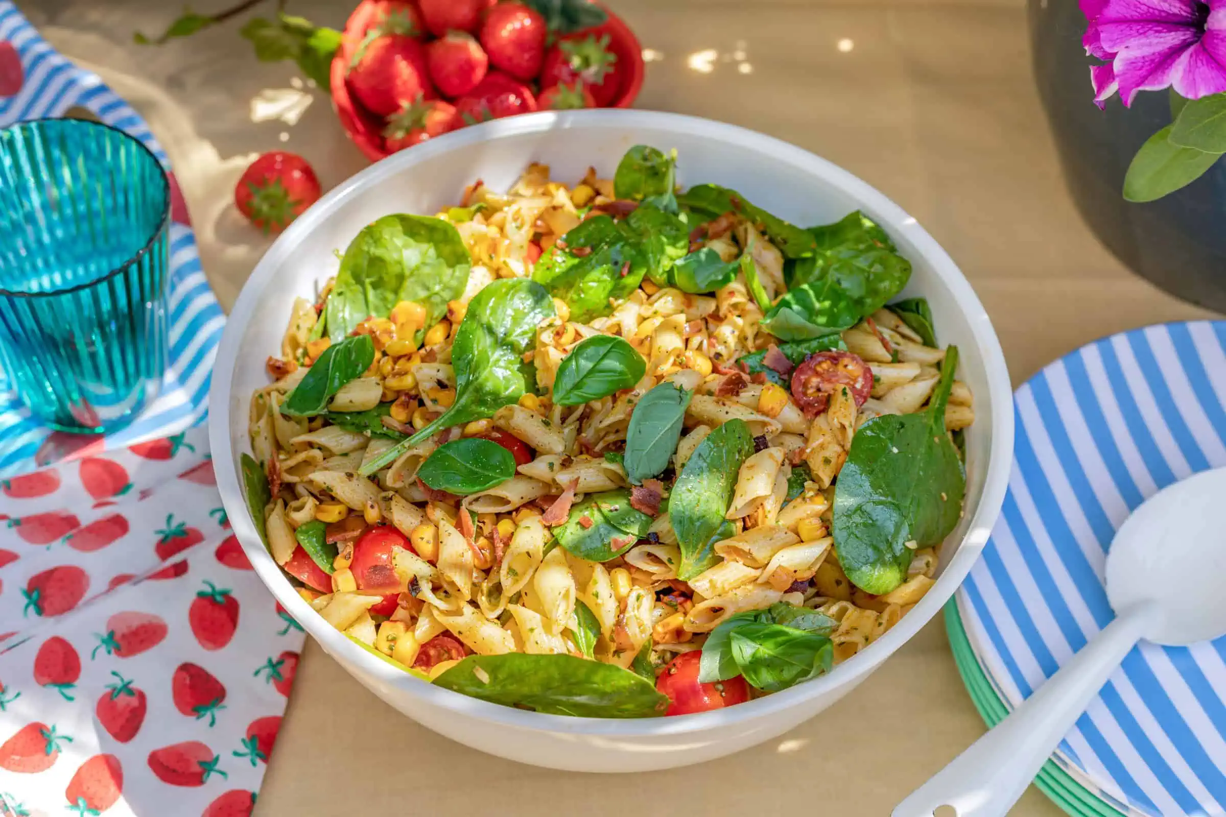Pastasalade met gegrilde mais, spinazie en pestodressing