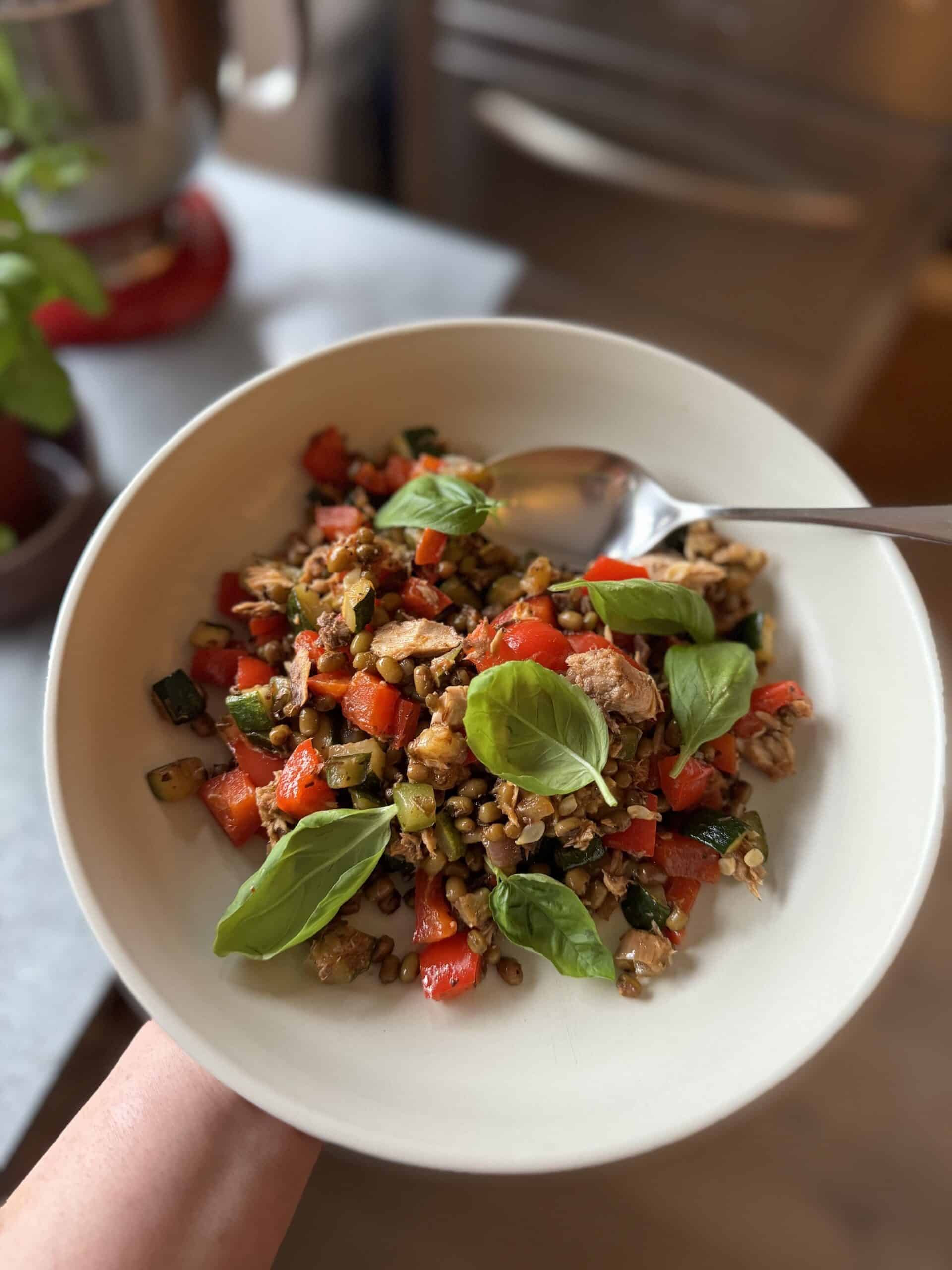 Maar nu eerst dit weekmenu waarmee je klaar bent voor deze nieuwe week. Je snapt vast dat ik nog niet all the way ben gegaan met de super zonnige gerechten. En aan het einde geef ik je de tip van de week, een super voedzame en snelle lunch die ik nu iedere week wel een keer maak met restjes groenten. En ik vertel je een groot geheim over de olijfolie die je in vis uit blik vindt.