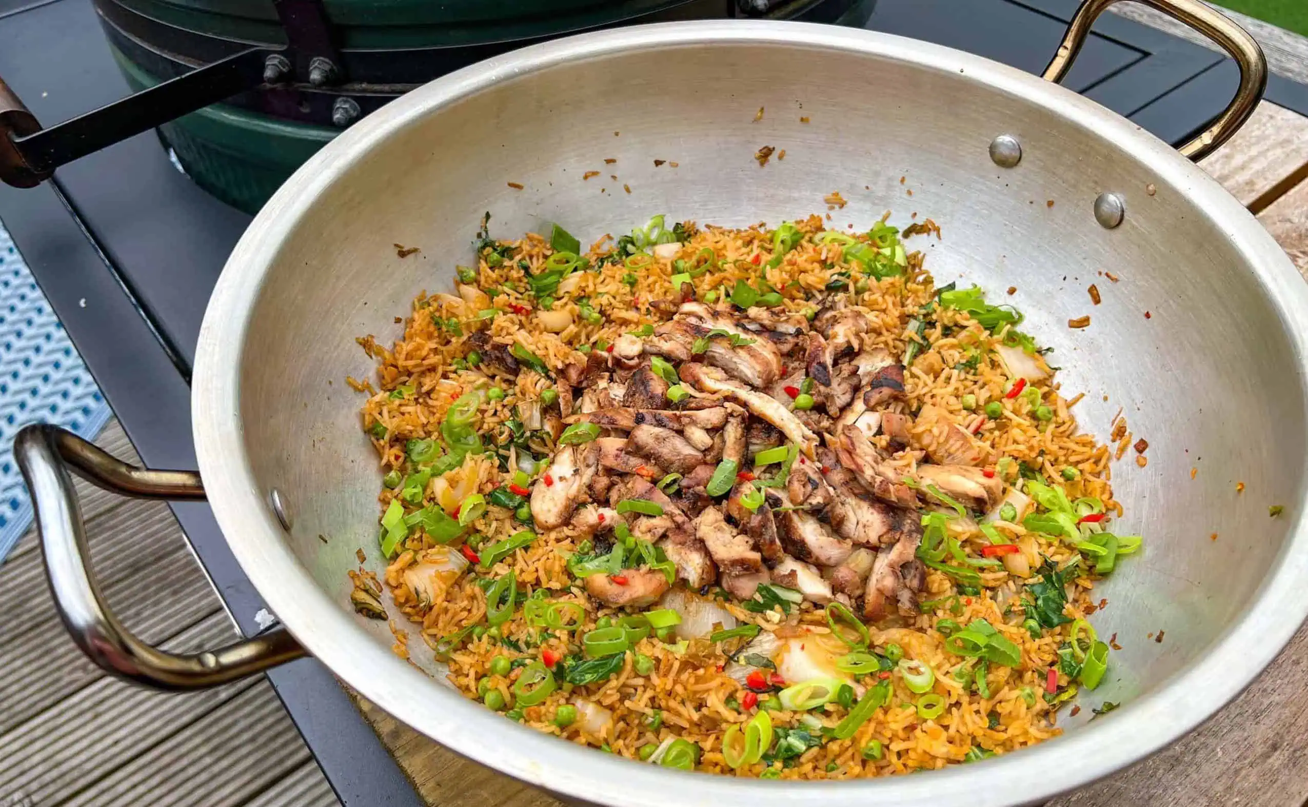 Vandaag steken we de barbecue aan en laat ik je zien hoe je een complete maaltijd erop maakt. Een van onze favorieten! Nasi van de barbecue met gegrilde kip. Is je barbecue nou net een tandje te klein om er een grote pan op te zetten, gril dan wel alle ingrediënten op de barbecue, maar maak de nasi verder af in een wok of grote braadpan op je kookplaat.