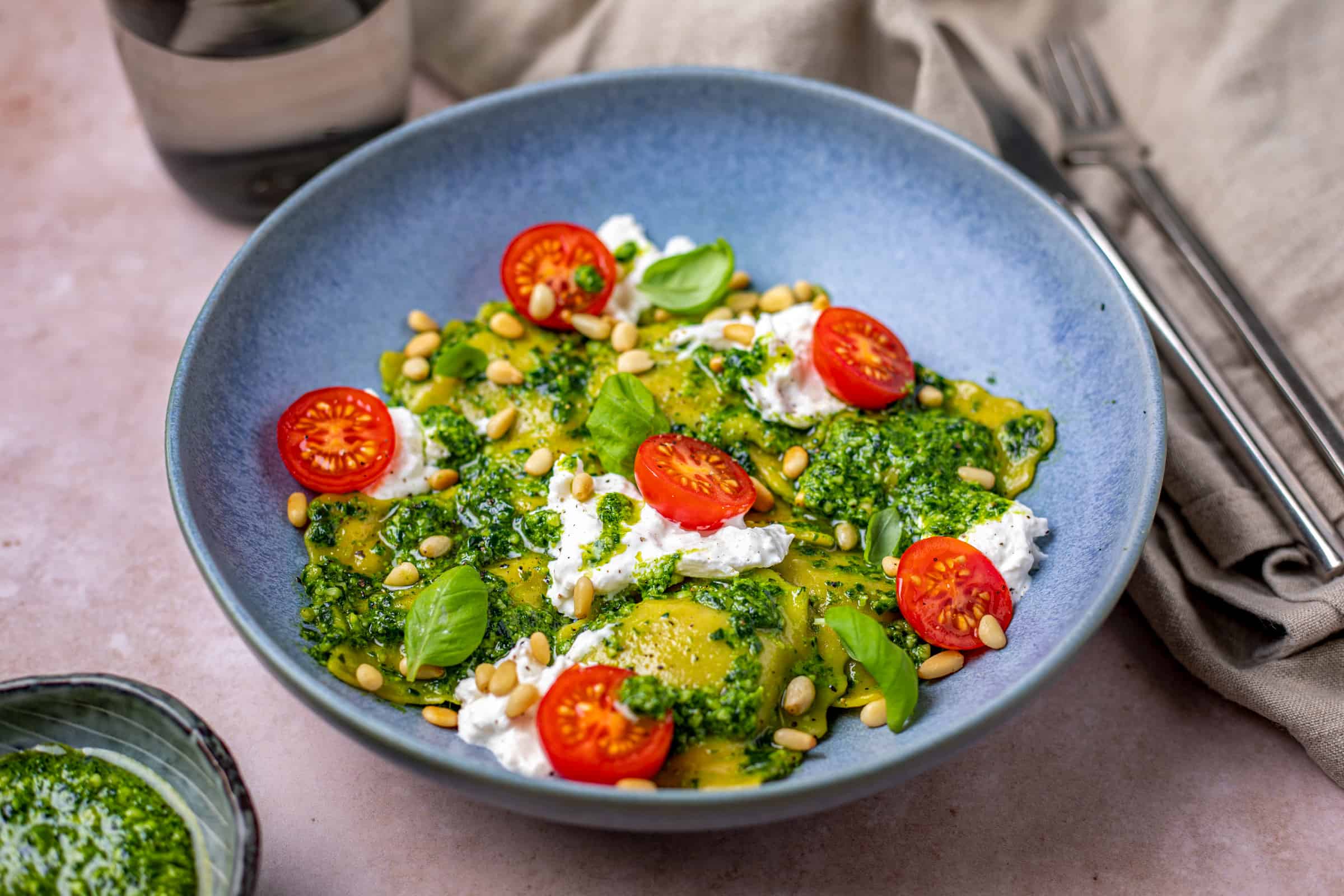 Ravioli met spinaziepesto, burrata en Honingtomaten