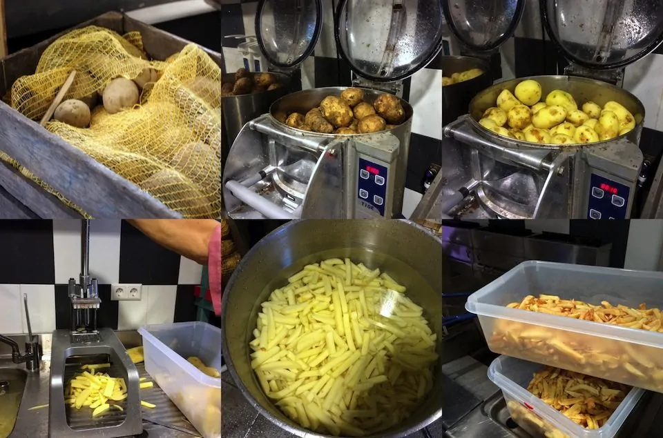 Natuurlijk hebben ze meer dan alleen frites en croquetten. Zo staan er ook burgers van het MRIJ rund, fish & chips, frikadellen, vega burgers en gemarineerde kippendijen op het menu. Alles huisgemaakt (de croquetten zijn deels van Holtkamp) tot en met de sauzen aan toe. Ik mag nog even een kijkje nemen in de keuken en daar laten ze me stap voor stap zien hoe de verse aardappelen geschild, gewassen en gesneden worden.