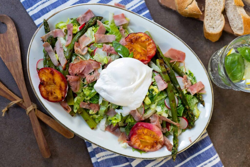 Salade met groene asperges, burrata en nectarines