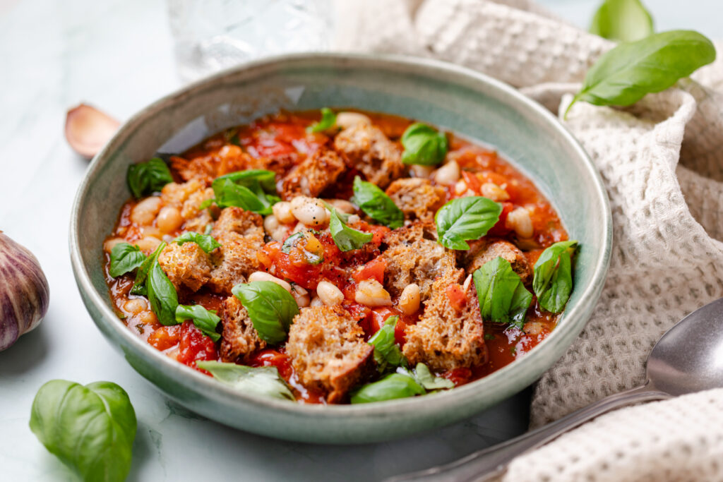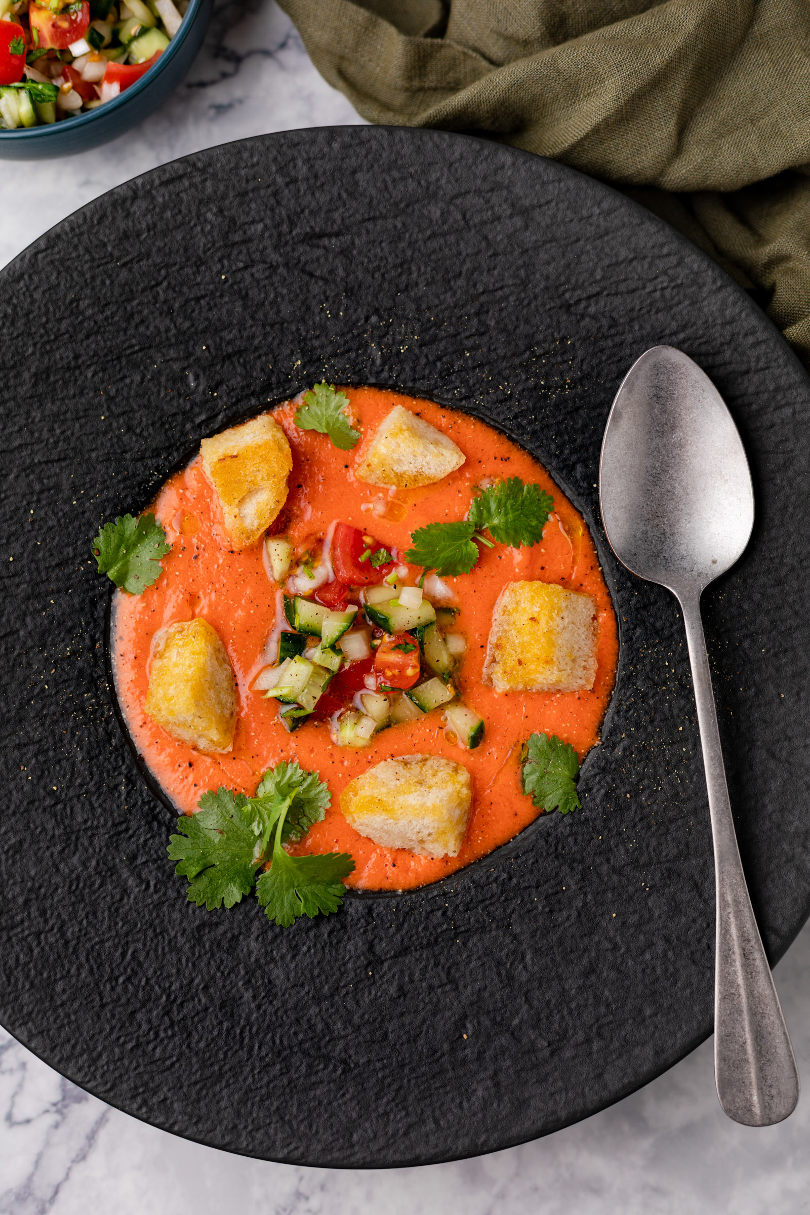 - Voor het serveren schenk je de gazpacho in glazen, kommetjes of een mooi diep bord. Garneer naar inzicht met de groentetopping, wat druppeltjes (gerookte) olijfolie, de knoflookcroutons en wat blaadjes koriander als je die nog hebt. Nog een vleugje gemalen zwarte peper erover en serveren maar. Geniet van deze heerlijke gazpacho!