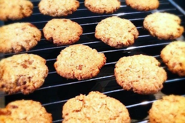 Ik heb deze koekjes onlangs gemaakt met ons nichtje en neefje. Nichtje mocht helpen wegen, kneden en balletjes rollen. En neefje was chef ‘balletje-door-de-kokos-rollen’ en verantwoordelijk voor de belangrijkste taak. Namelijk het plat slaan van de balletjes tot koekjes…en dat is hele serieuze business voor zo’n klein jochie. Ik heb