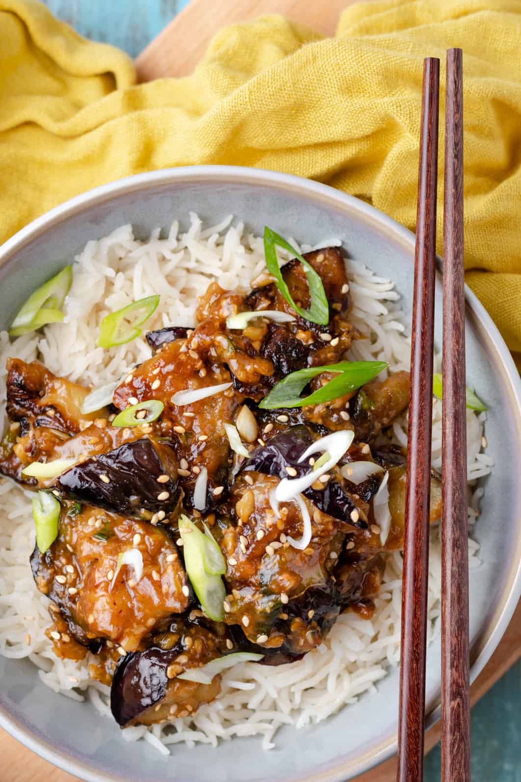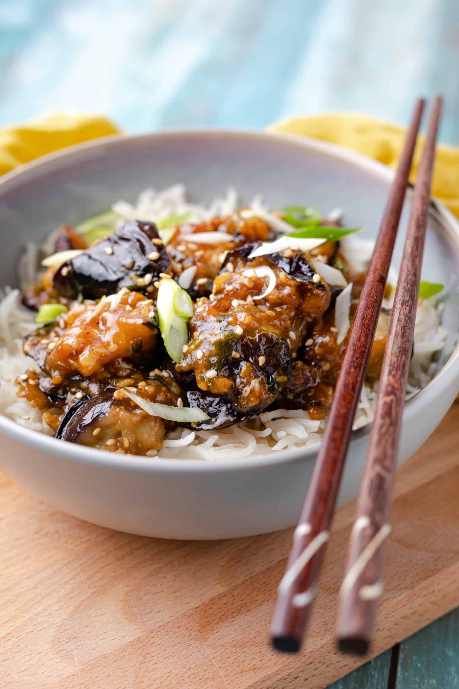 - Serveer de miso aubergine met de witte rijst en garneer met wat ringetjes groene lente-ui en de sesamzaadjes.