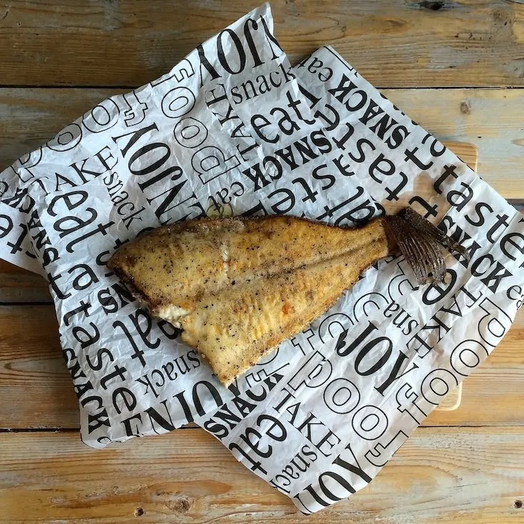 De reden waarom ik 2 schollen van 500 gram heb aangegeven is omdat een schol van 1 kilo niet in de gemiddelde huis-, tuin- en keukenpan past. Nou heb ik thuis een hele grote pan en zelfs daar was het wat proppen aan de zijkanten. Dus maak het jezelf makkelijk en pak iets kleinere schollen.