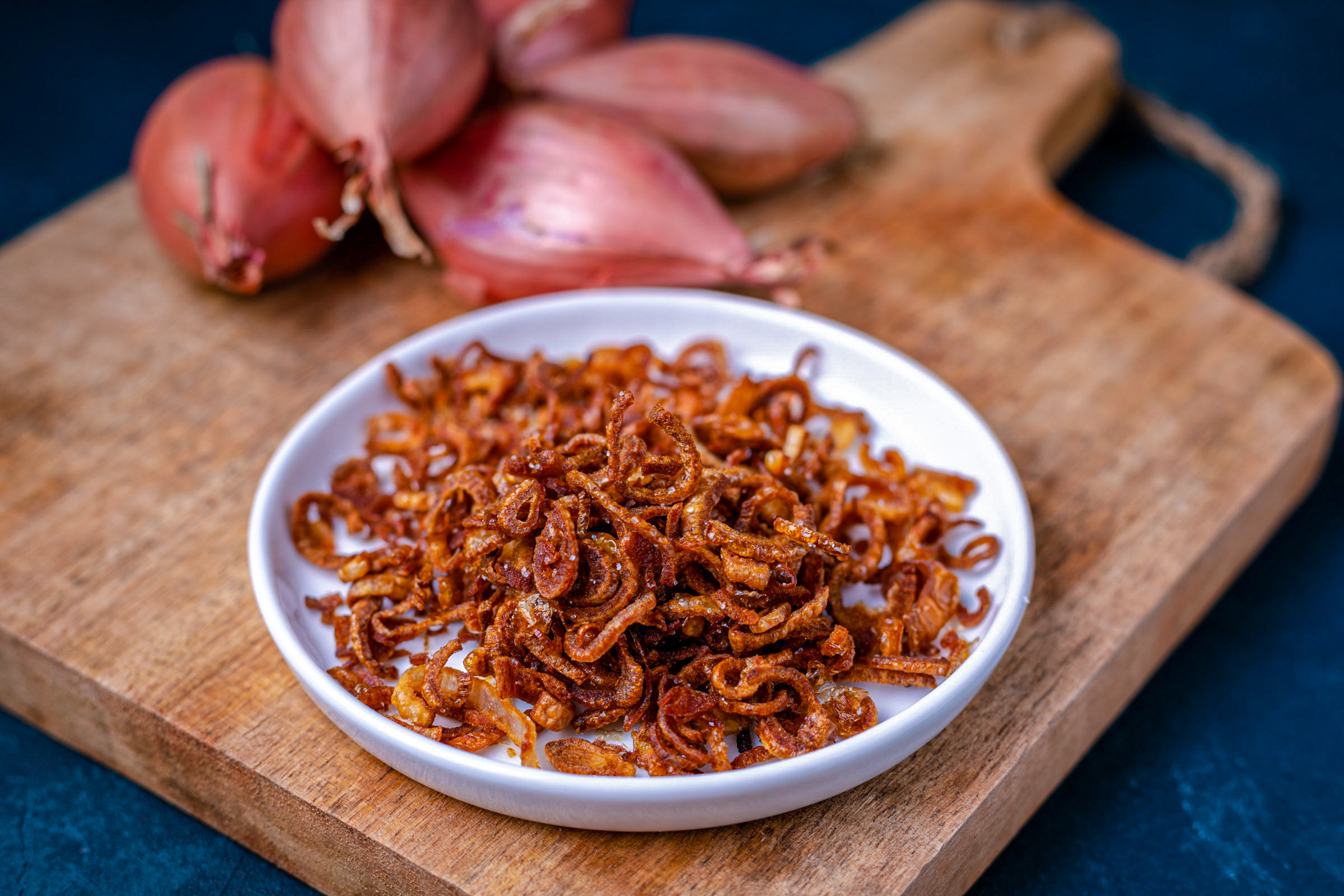 Er zijn een paar dingen die ik ongegeneerd kan blijven eten en gefrituurde sjalotjes (oftewel gebakken uitjes) is er daar een van. De smaak en knapperigheid zijn voor mij verslavend lekker en ik gebruik het daarom (misschien iets te) vaak als garnering. In ieder geval op tal van Aziatische gerechten, op mijn boerenkoolstamppot en zelfs op een broodje met pindakaas en sambal, maar daar moet je van houden haha.