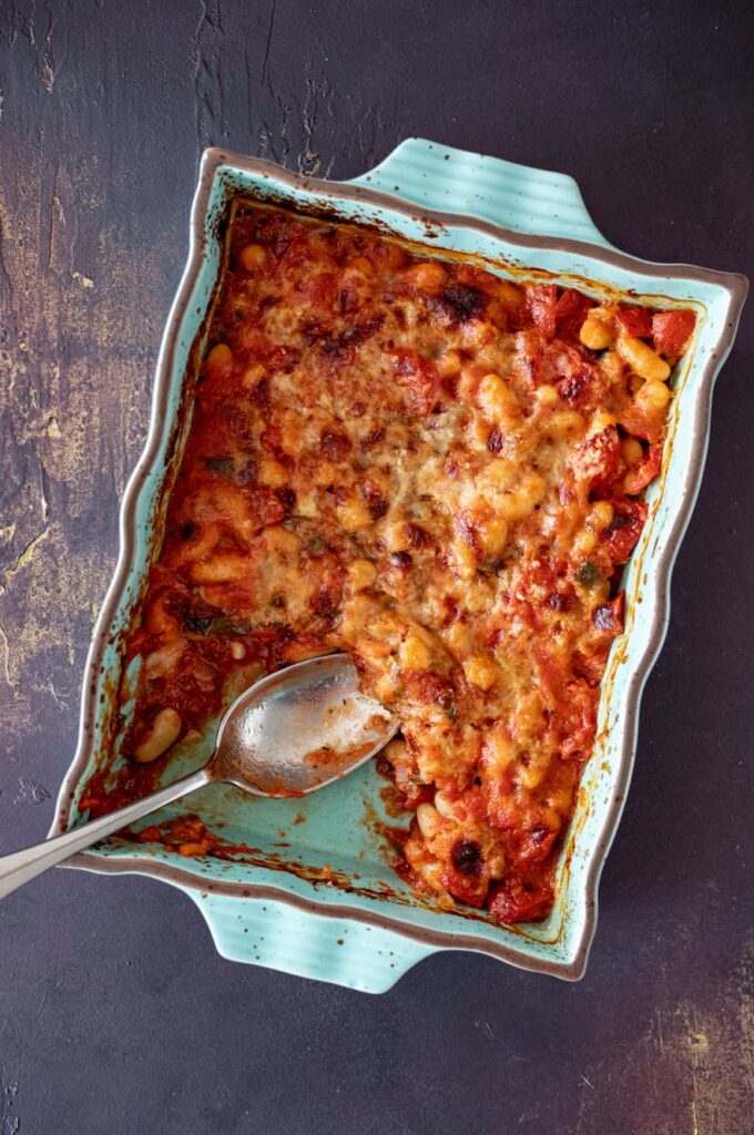 - Vul een middelgrote ovenschaal met de cannellini bonen, sjalot, trostomaten, oregano, basilicum, snuf zout en peper. Schep alles door elkaar en verdeel gelijkmatig. Strooi de geraspte kaas erover en zet de schaal 25 minuten in de oven. Daarna mag de grill nog 5 minuten aan voor een mooi krokant laagje.