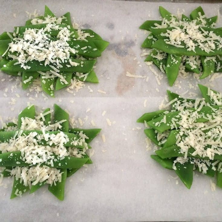 – onderste laag: 3 snijbonen verticaal naast elkaar > strooi hier wat Parmezaanse kaas over