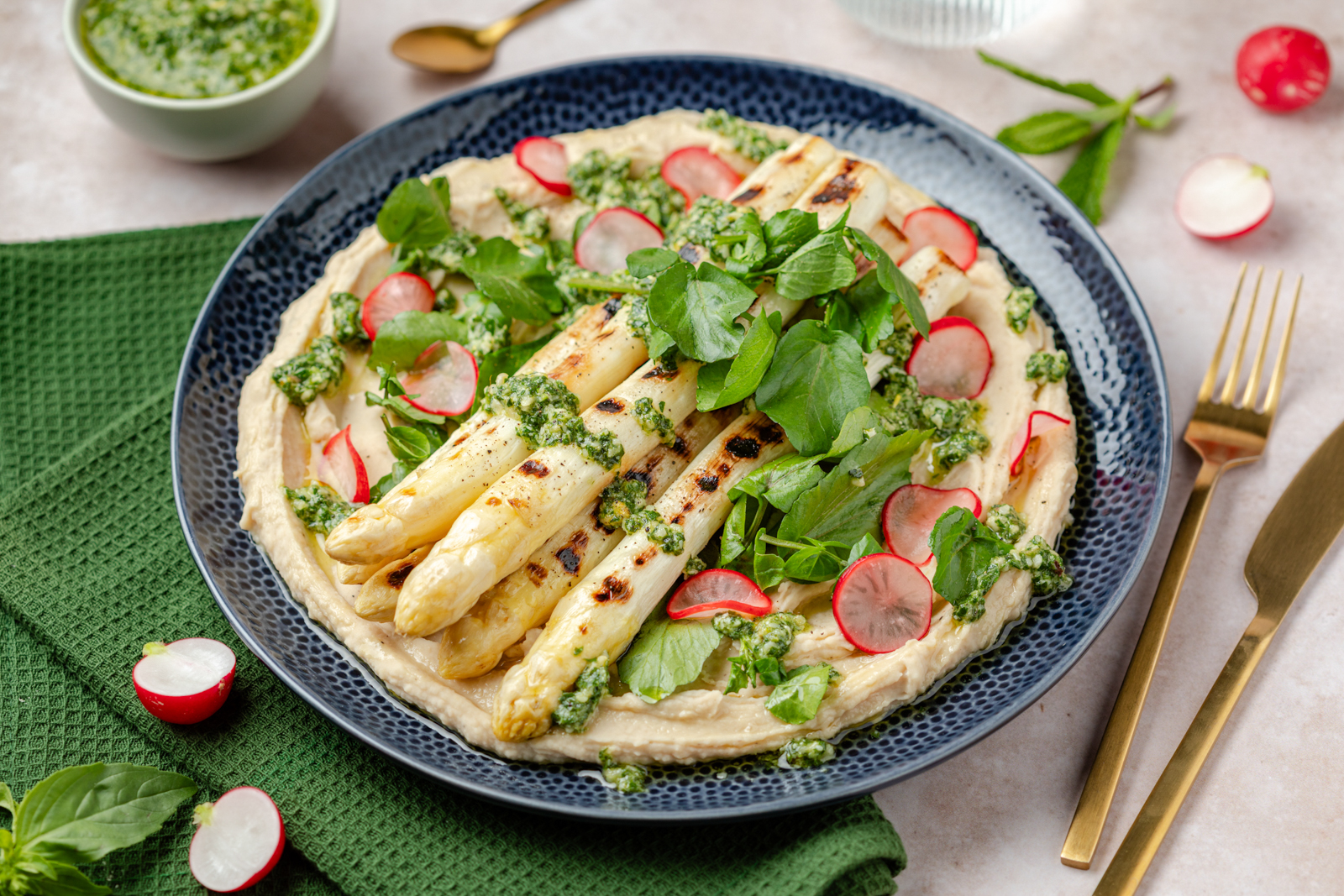 - Schep de boterbonenpuree op een groot bord of schaal en strijk uit met een spatel. Leg de gegrilde asperges erop. Druppel de voorjaarspesto erover. Verdeel de zoetzure radijsjes en eindig met een handvol waterkers. Serveer direct.