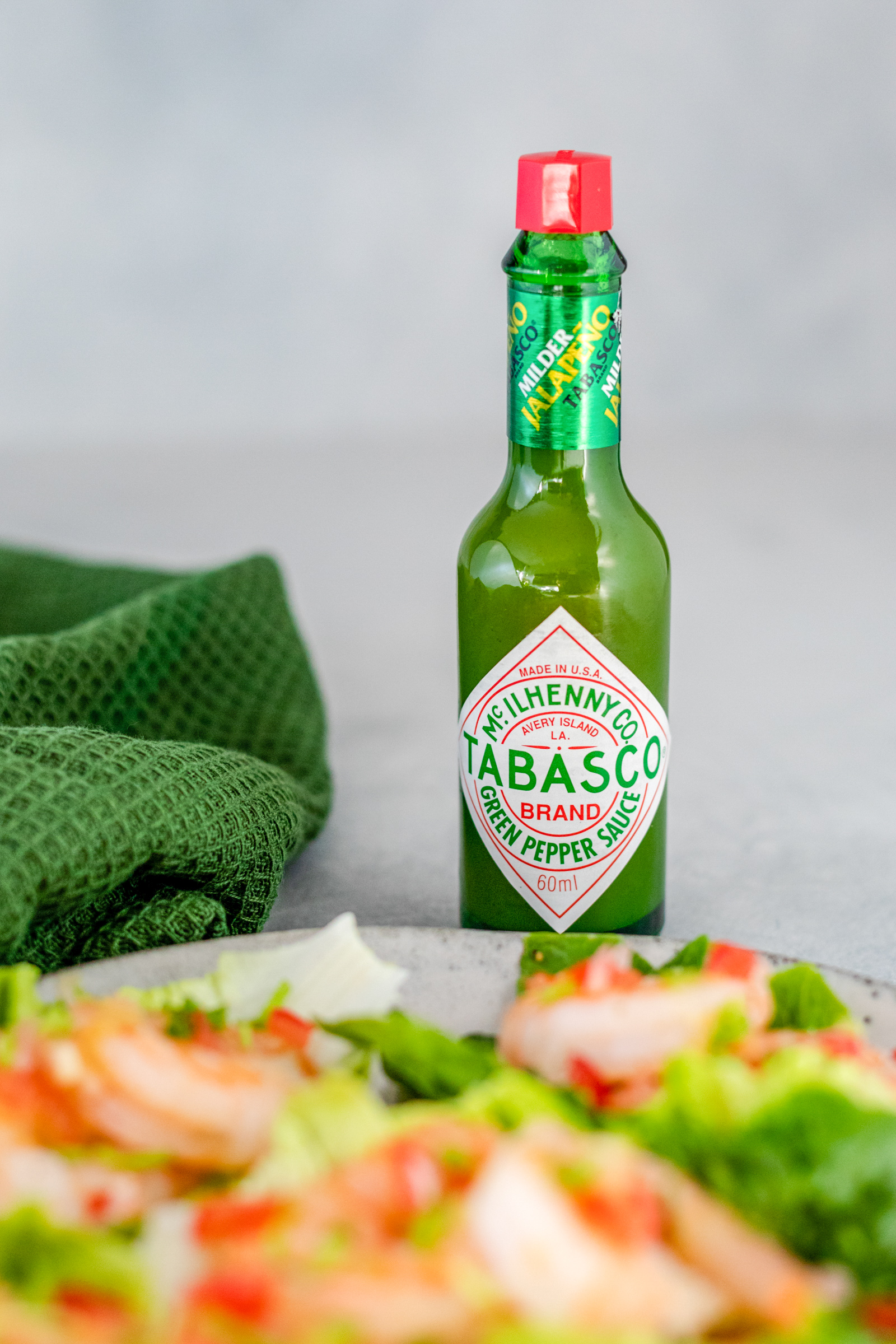 Ik ben dus dol op tabasco, maar ik vergeet vaak dat ik het in huis heb. Het is ook een van de meest pure pepersauzen, omdat het van alleen azijn, pepers en een beetje zout wordt gemaakt. Misschien moet ik het flesje gewoon wat prominenter in mijn koelkast zetten ;-). Want nu ik weer wat druppels van ervan combineerde met deze garnalen werd ik heel blij.  De tabasco uit het groene flesje wordt gemaakt van Jalapeño pepers en is milder dan de klassieke tabasco uit het rode flesje. Nog steeds heb je maar een paar druppels nodig om de smaak meer diepgang te geven.