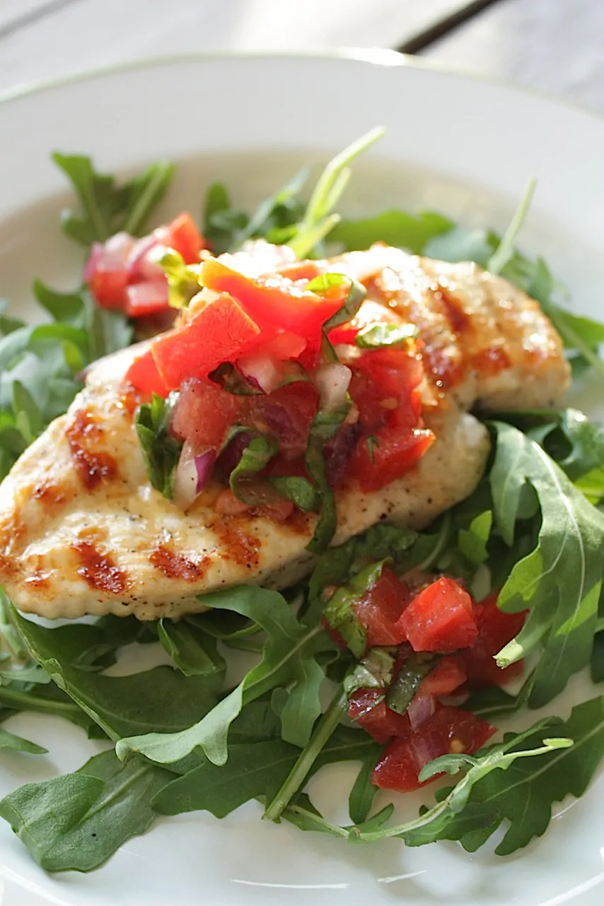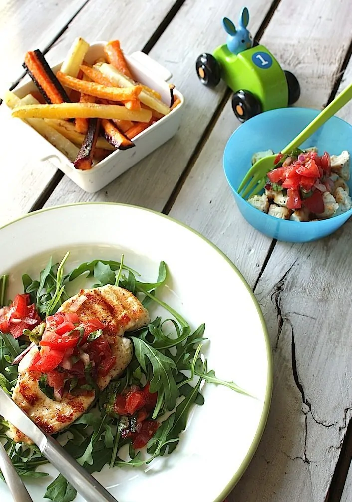 Voor de grote mensen maak je een bord op met een flinke hand rucola. Deze maak je aan met een beetje olijfolie, peper en zout. Voor de liefhebbers mag hier ook nog een scheutje balsamico bij. Leg hier een stukje gegrilde kip op en schep daar weer een flinke eetlepel tomaat basilicum salsa op.