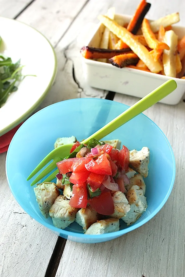 Gisteravond wilde ik gegrilde kip eten met tomaat basilicum salsa. Voor mij en the Mr. geserveerd op een bedje rucola en voor de peuter net iets anders, want ja ‘rucola is gras…’. Ik had ook nog een zak gekleurde bospeen van de biowinkel liggen en besloot daar wortelpatatjes van te maken als bijgerecht.