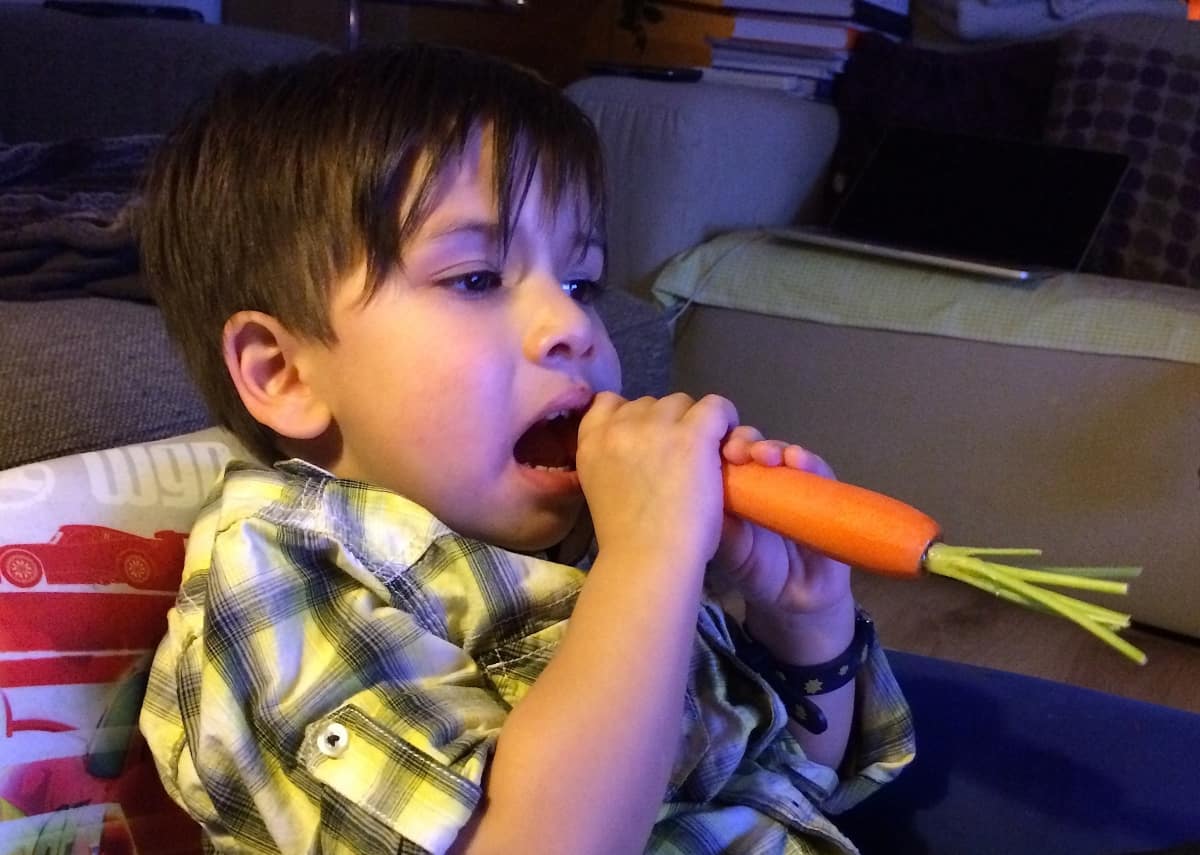 Klinkt best leuk en lekker dit bovenstaande hè? Het kwam ook echt allemaal zo op tafel bij ons en ik was helemaal in mijn nopjes. Maar Jessey de peuter was moe en had geen zin in eten. Dus al mijn mooie plannen vielen in het water. Kip had hij geen zin in, de wortelfrietjes waren niet interessant en puntje bij paaltje zat hij als een soort Rodger Rabbit een paar rauwe wortels (die ik nog in de koelkast had) te eten met een bruschetta broodje erbij. En dat is misschien nog wel de meeste ‘wijze les’ die ik jullie kan meegeven in deze blog. Geen enkel kind eet uit het boekje. De ene dag gaat het top, de andere dag niet en het is vaak maar afwachten. Maak je daar niet druk om en wees ook op dat gebied creatief. Gewoon doorzetten, het komt vanzelf goed. En in de tussentijd zelf heel lekker blijven eten waar je kind bij is. Daar leren ze ook heel veel van 😉